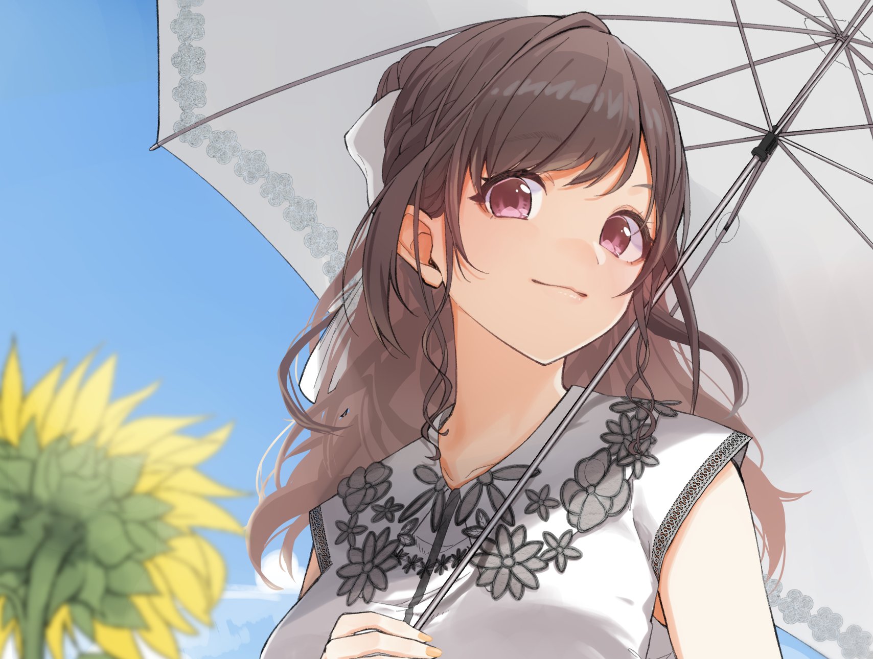 1girl blue_sky brown_hair comiket_100 eyebrows_hidden_by_hair floral_print flower hair_ornament highres holding holding_umbrella idolmaster idolmaster_shiny_colors long_hair looking_at_viewer pekoni_(peconi) purple_eyes shirt sky sleeveless sleeveless_shirt smile solo sunflower tsukioka_kogane umbrella upper_body