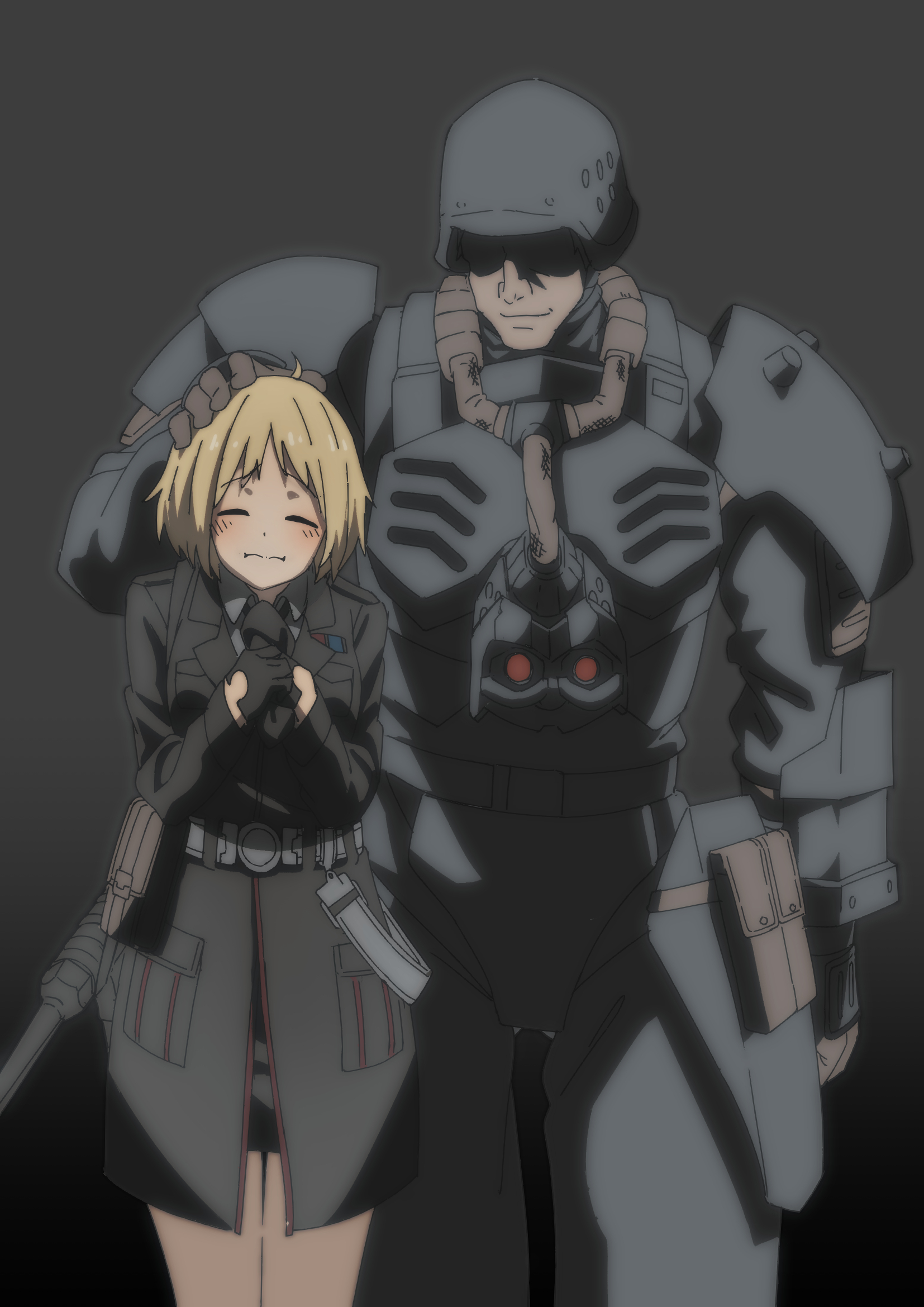 1boy 1girl armor black_armor black_gloves blonde_hair chinese_commentary commission faceless faceless_male garrison_cap gas_mask girls'_frontline gloves gun hat headpat height_difference helmet highres holding holding_unworn_clothes holding_unworn_hat jin-roh jin_roh kerberos_saga long_sleeves mask md5_mismatch military military_uniform mp40 mp40_(girls'_frontline) necktie pixiv_commission resolution_mismatch shirt short_hair simple_background source_smaller submachine_gun triangle_bullet unworn_hat unworn_headwear weapon