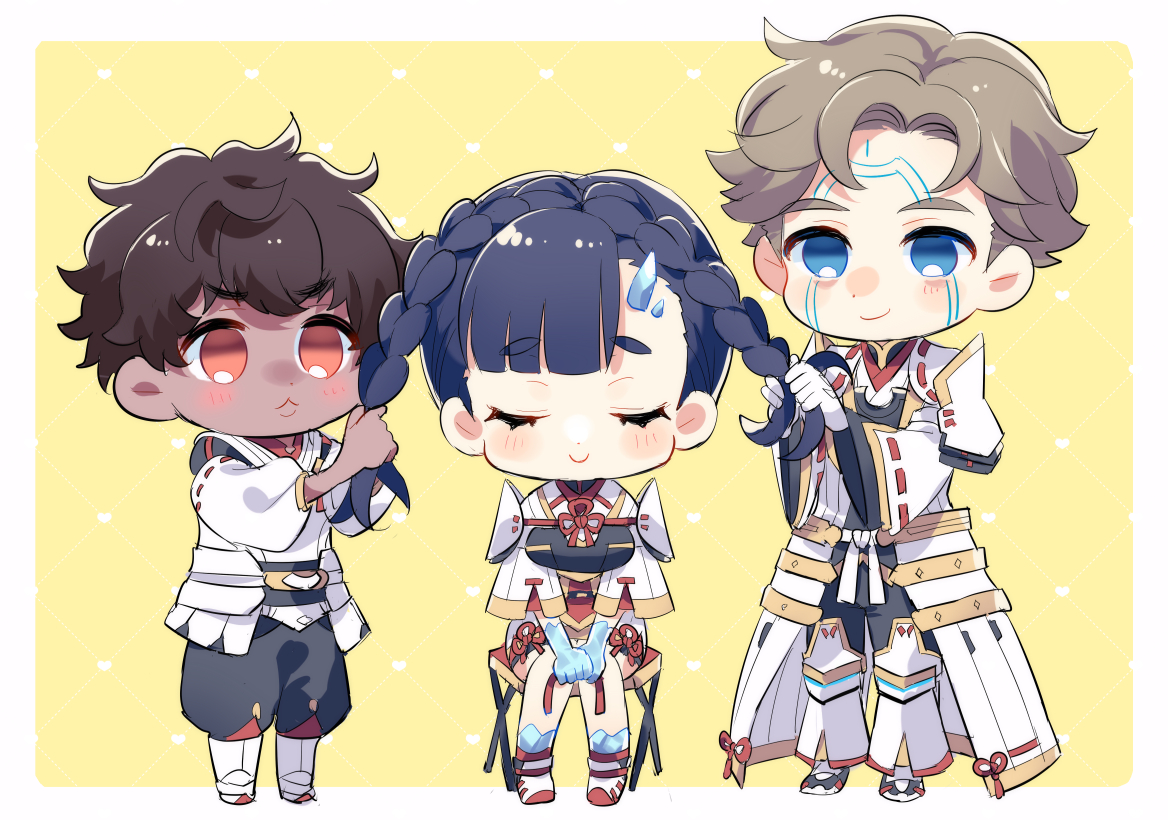 1girl 2boys :< blue_eyes blue_hair blush border braiding_hair chibi cloak closed_mouth dark-skinned_male dark_skin glowing_lines hairdressing himeno345 ice isurd_(xenoblade) multiple_boys nimue_(xenoblade) no_pupils orange_eyes smile taion_(xenoblade) white_border xenoblade_chronicles_(series) xenoblade_chronicles_3 yellow_background