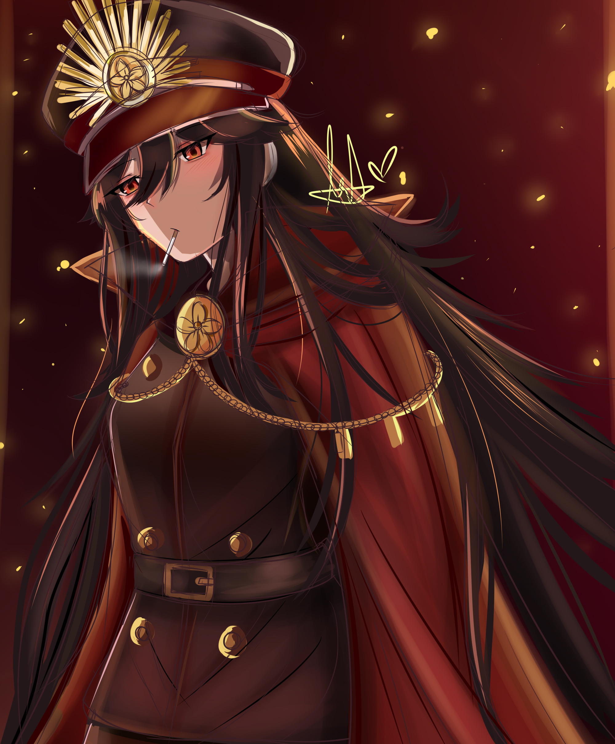 1girl absurdres akury cigarette fate/grand_order fate/type_redline fate_(series) half-closed_eyes hat highres koha-ace light_particles long_hair looking_away military military_hat oda_nobunaga_(fate) oda_nobunaga_(koha-ace) red_background simple_background solo tagme