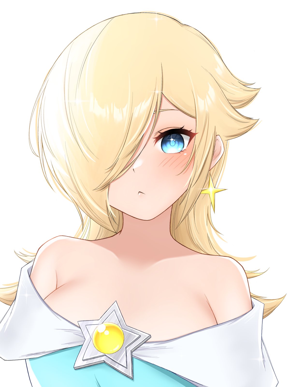 1girl :< bare_shoulders blonde_hair blue_eyes breasts closed_mouth hair_over_one_eye highres large_breasts long_hair looking_at_viewer mario_(series) nintendo off_shoulder rosalina simple_background solo star_(symbol) super_mario_galaxy tomatomiya upper_body white_background