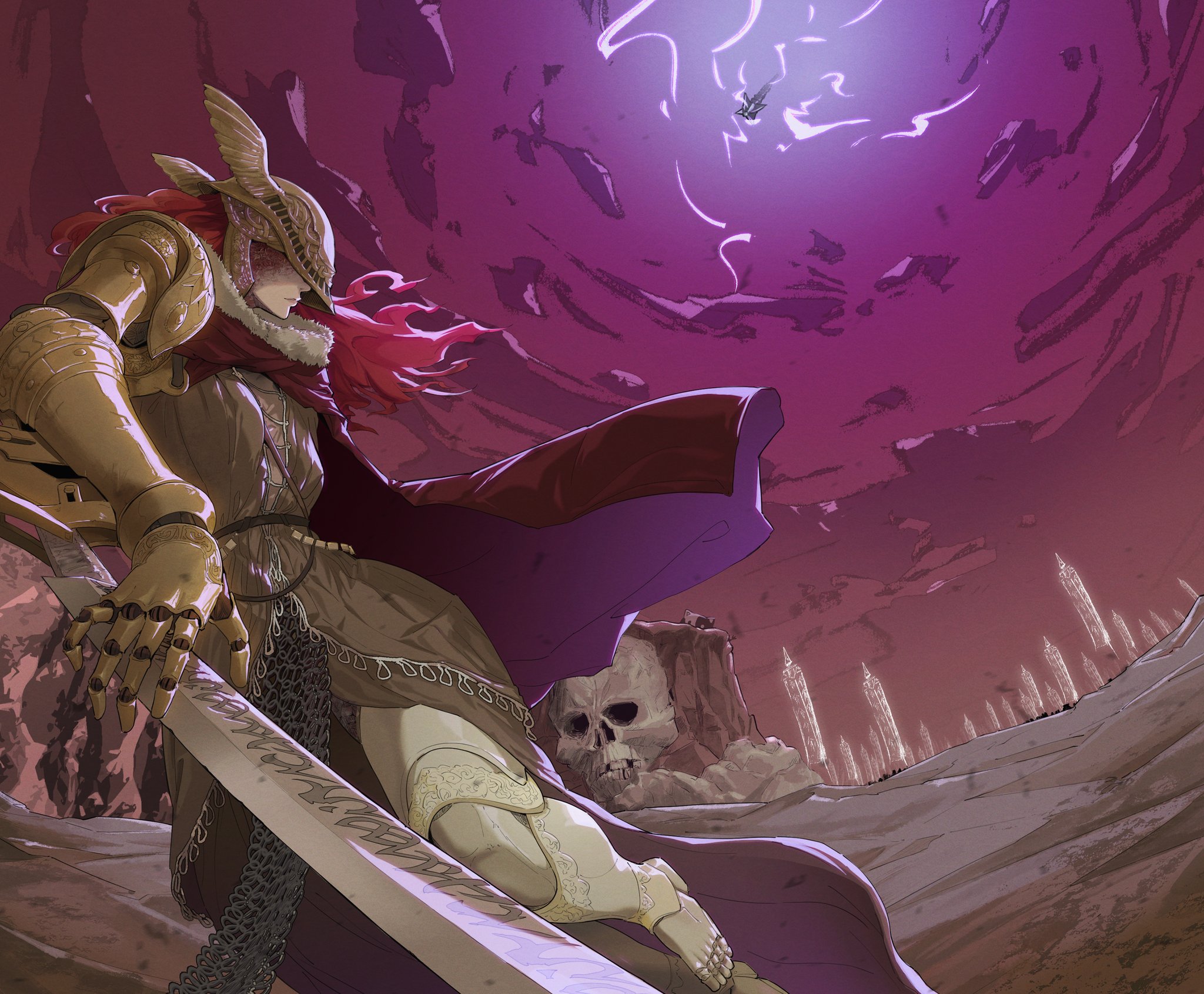 1girl armor blade cape covered_eyes dress elden_ring helmet highres hiko_(hiko224556) holding holding_sword holding_weapon long_hair malenia_blade_of_miquella mechanical_arms prosthesis prosthetic_arm prosthetic_leg red_cape red_hair sky solo sword thunder valkyrie very_long_hair weapon winged_helmet
