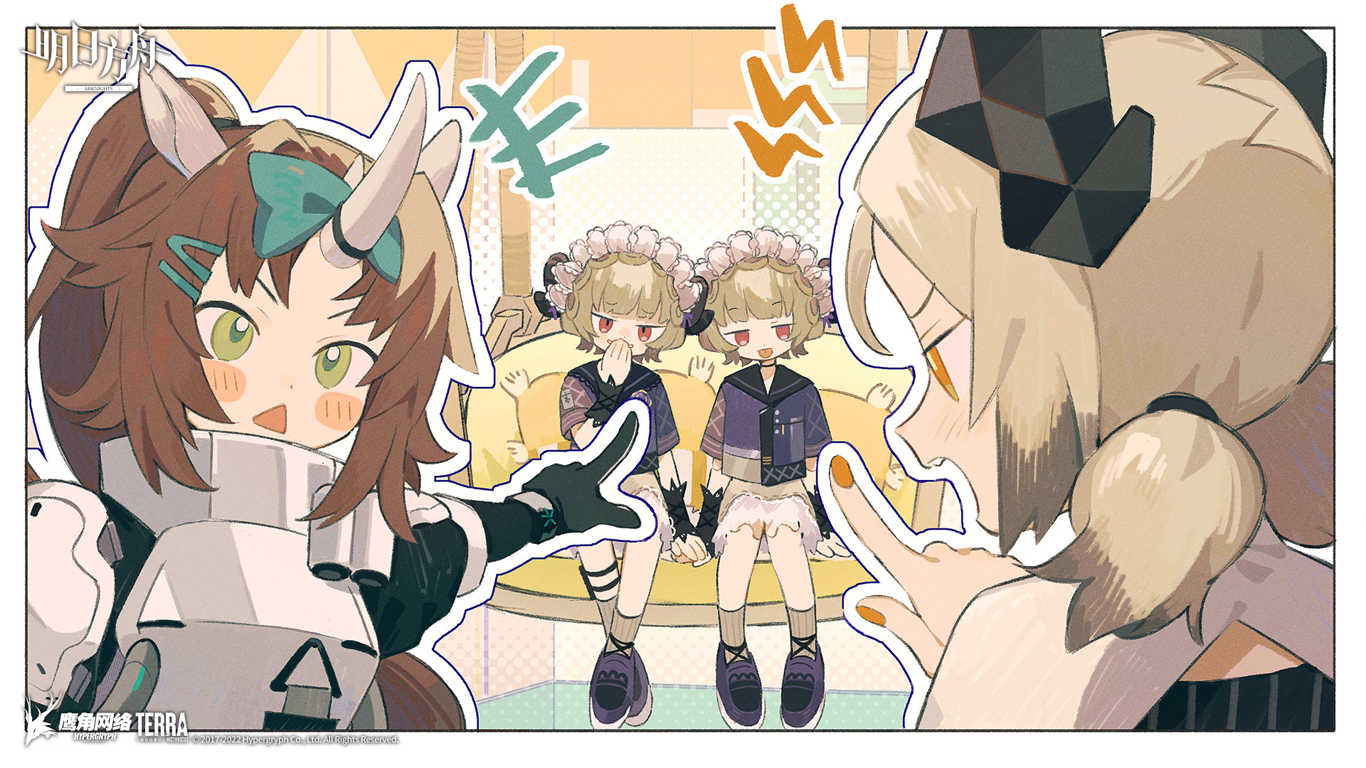 +++ 4girls animal_ears arknights armor bena_(arknights) black_gloves black_shirt blonde_hair blush bow bracelet breastplate brown_hair brown_socks bubble_(arknights) copyright_name covering_own_mouth demon_horns gloves green_bow green_eyes hair_bow hair_ornament hairclip headdress highres holding_hands horns ifrit_(arknights) infection_monitor_(arknights) jewelry jitome laughing long_hair multiple_girls nail_polish official_art orange_eyes orange_nails pointing ponytail purple_footwear purple_shirt red_eyes rhinoceros_girl ribbed_socks shirt shoes short_hair short_twintails single_horn sitting skirt socks triangle_mouth twintails