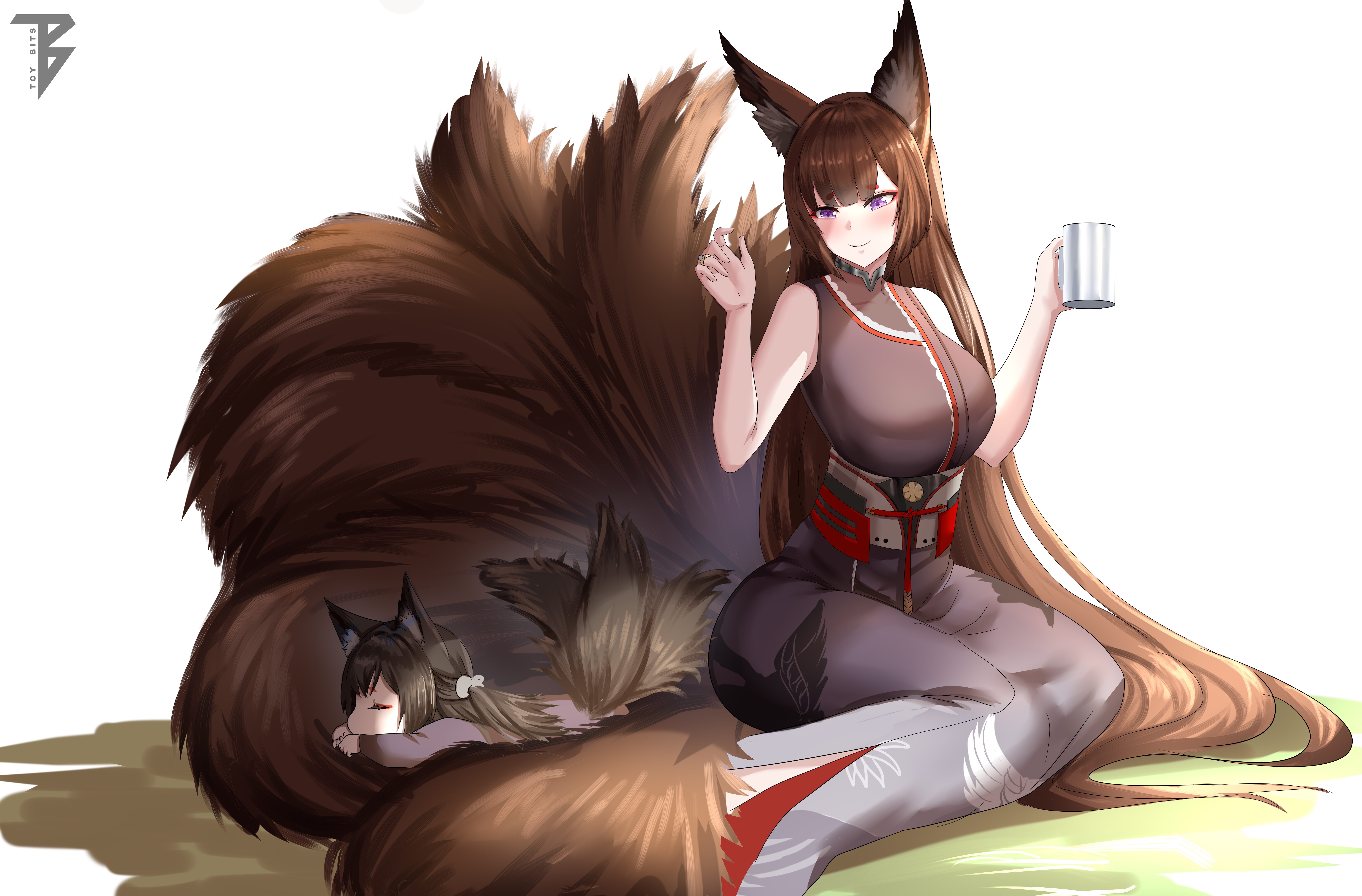 2girls absurdres amagi_(azur_lane) animal_ears azur_lane breasts brown_hair commission coolguy6267 cup fox_ears fox_tail highres holding holding_cup japanese_clothes jewelry large_breasts long_hair lying mother_and_child mother_and_daughter multiple_girls multiple_tails on_stomach ornate_ring parent_and_child purple_eyes ring second-party_source sleeping smile tail toy_bits twintails very_long_hair wedding_ring white_background