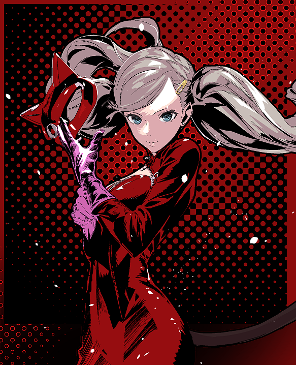 1girl blonde_hair bodysuit cat_mask catsuit cofffee cowboy_shot gloves hair_ornament hairclip mask panther_(persona_5) persona persona_5 pink_gloves red_background red_bodysuit smile solo takamaki_anne twintails unworn_mask