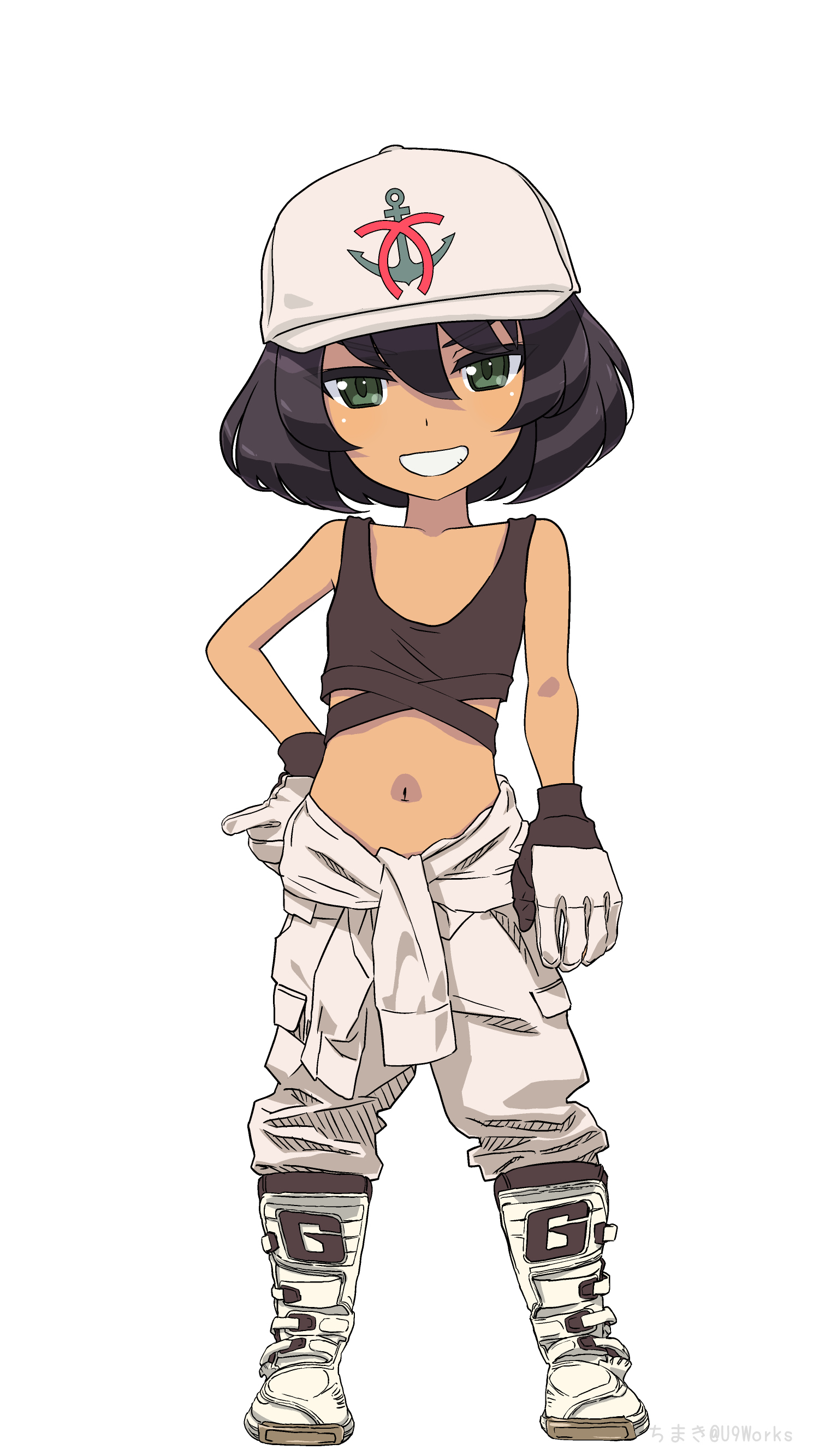 1girl absurdres akagi_(fmttps) black_hair blush boots collarbone crop_top flat_chest full_body girls_und_panzer gloves green_eyes grin hand_on_own_hip hat highres hoshino_(girls_und_panzer) looking_at_viewer midriff navel pants shiny_skin short_hair simple_background smile solo standing white_background white_pants