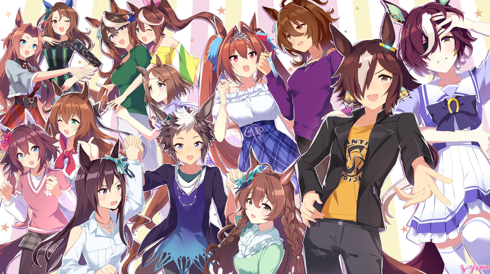 6+girls agnes_tachyon_(casual)_(umamusume) agnes_tachyon_(umamusume) ahoge animal_ears aqua_eyes bare_shoulders black_pantyhose blonde_hair blue_eyes bow braid breasts brown_hair daiwa_scarlet_(casual)_(umamusume) daiwa_scarlet_(umamusume) ear_bow ear_covers earrings flower green_skirt hair_between_eyes hair_flower hair_intakes hair_ornament hair_over_one_eye hairclip highres holding_hands horse_ears horse_girl horse_tail jewelry kawakami_princess_(casual)_(umamusume) kawakami_princess_(umamusume) king_halo_(casual)_(umamusume) king_halo_(umamusume) large_breasts long_hair long_sleeves looking_at_viewer maruzensky_(casual)_(umamusume) maruzensky_(umamusume) mejiro_bright_(casual)_(umamusume) mejiro_bright_(umamusume) mejiro_dober_(casual)_(umamusume) mejiro_dober_(umamusume) mejiro_ryan_(casual)_(umamusume) mejiro_ryan_(umamusume) multicolored_hair multiple_girls necklace official_alternate_costume one_eye_closed open_mouth outstretched_arm pantyhose purple_eyes purple_serafuku red_eyes ryuu_(ryuraconis) sakura_chiyono_o_(casual)_(umamusume) sakura_chiyono_o_(umamusume) school_uniform serafuku shirt single_earring skirt smile streaked_hair striped_clothes striped_shirt symboli_rudolf_(casual)_(umamusume) symboli_rudolf_(umamusume) tail tanino_gimlet_(umamusume) thighhighs tokai_teio_(casual)_(umamusume) tokai_teio_(umamusume) tracen_school_uniform tsurumaru_tsuyoshi_(umamusume) two_side_up umamusume very_long_hair vodka_(casual)_(umamusume) vodka_(umamusume) white_background white_thighhighs