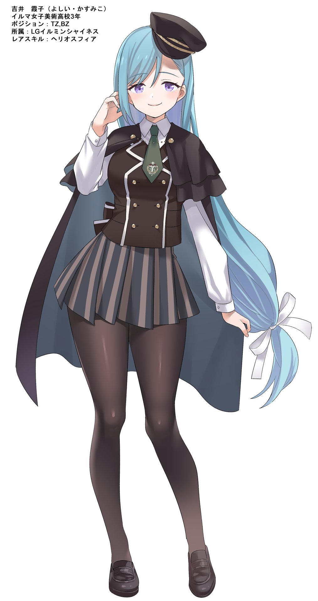 1girl arm_at_side assault_lily asymmetrical_bangs black_cape black_hat black_pantyhose black_shoes black_vest blue_cape blue_hair breasts brown_pantyhose brown_skirt buttons cape character_profile closed_mouth collared_shirt commentary_request double-breasted emblem fingernails full_body green_necktie grey_skirt hair_between_eyes hair_ribbon hand_in_own_hair hand_up hat highres kuroda_bb light_blush loafers long_hair looking_at_viewer low-tied_long_hair medium_breasts miniskirt necktie official_art pantyhose peaked_cap pleated_skirt purple_eyes ribbon school_uniform shirt shoes short_necktie simple_background skirt smile solo standing striped_clothes striped_skirt tilted_headwear translation_request two-sided_cape two-sided_fabric two-tone_skirt vertical-striped_clothes vertical-striped_skirt very_long_hair vest white_background white_ribbon white_shirt yoshii_kasumiko