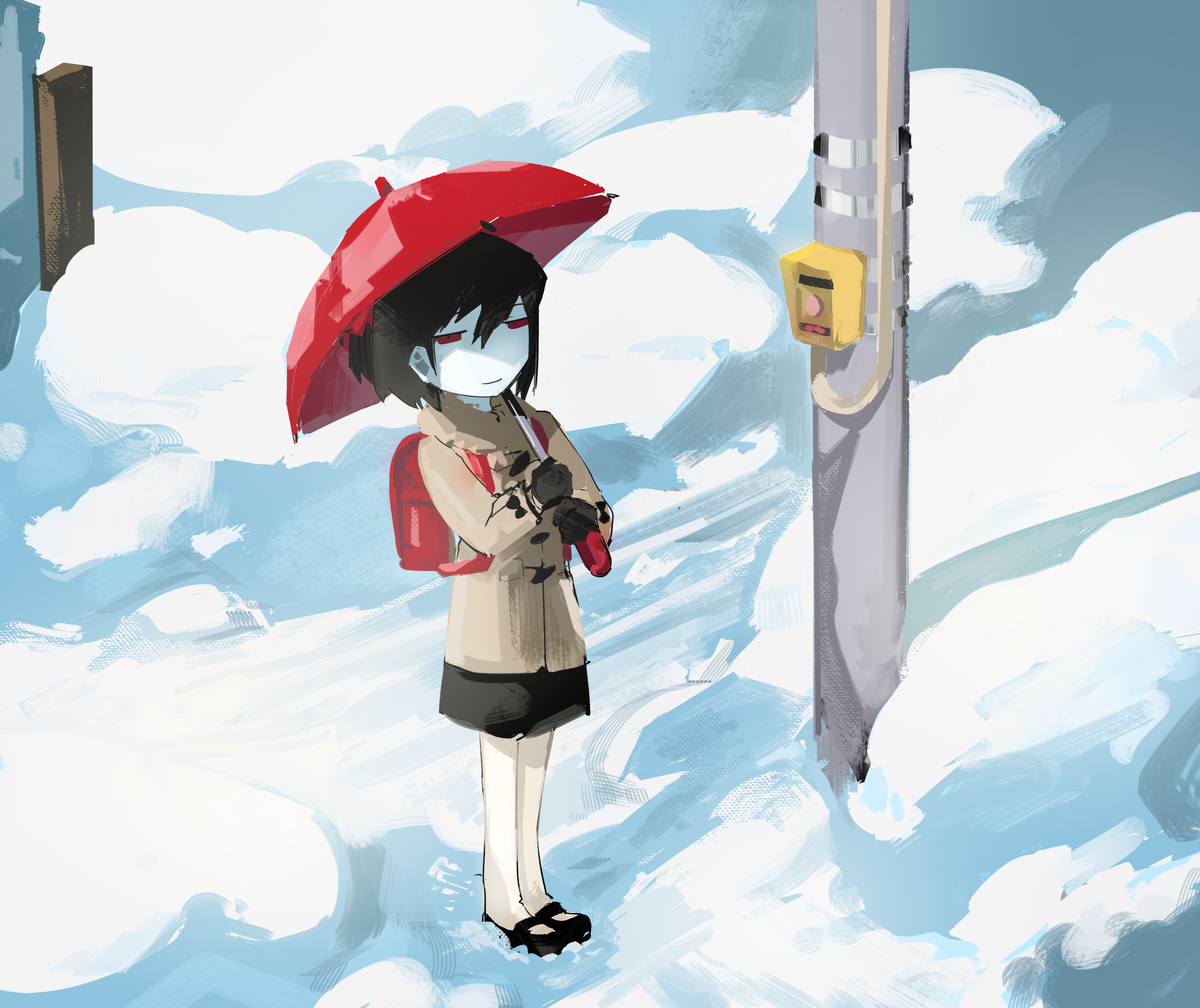 1girl absurdres backpack bag black_gloves black_hair black_shoes black_skirt bow brown_coat closed_mouth coat colored_skin commentary_request cookie_(touhou) full_body gloves hair_bow highres holding holding_umbrella ishizaki_(ishizaki100) looking_at_viewer mary_janes outdoors red_bag red_bow red_eyes red_umbrella shaded_face shoes short_hair siyudi_(cookie) skirt smile snow solo standing umbrella utility_pole white_skin