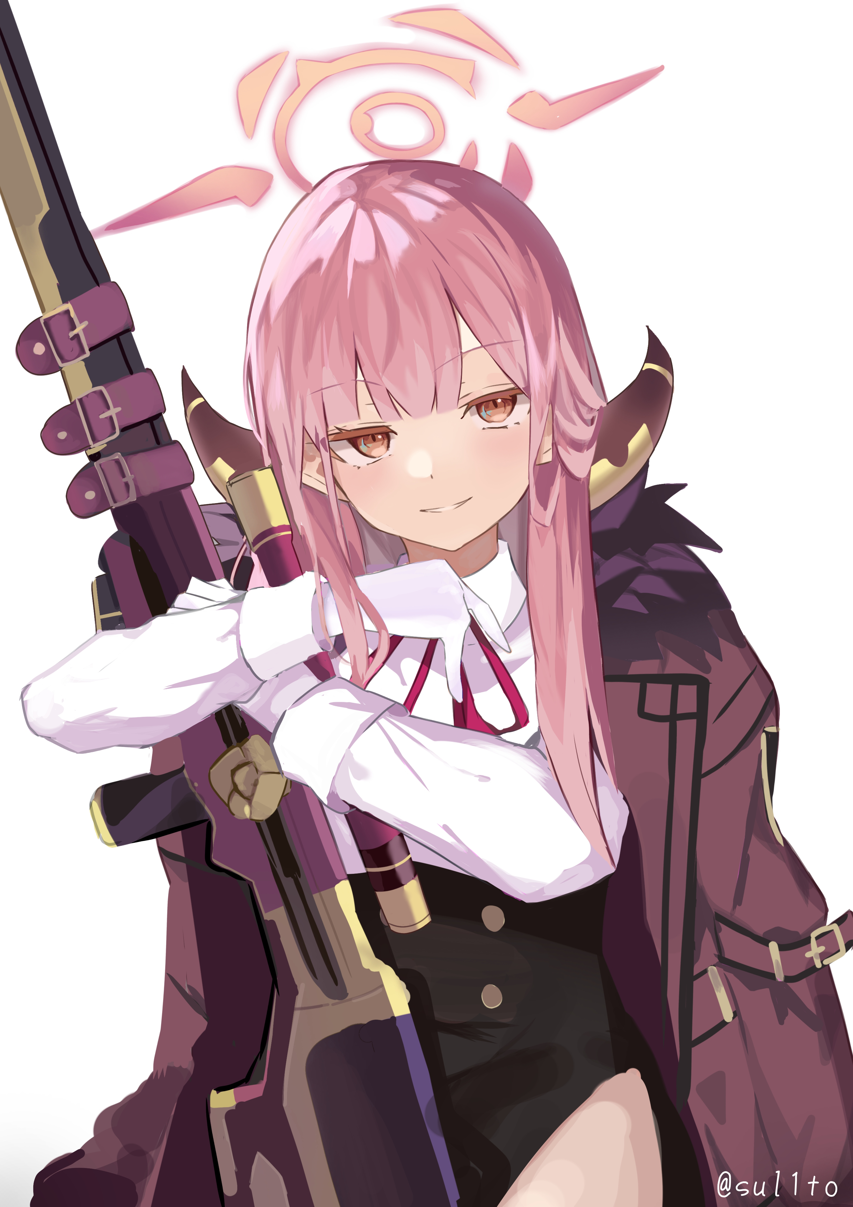 1girl absurdres aru_(blue_archive) blue_archive blunt_bangs buttons collared_shirt dress_shirt fur-trimmed_jacket fur_trim gloves gun h&k_psg1 halo highres holding holding_gun holding_weapon horns jacket long_hair long_sleeves open_mouth pencil_skirt red_eyes red_hair red_jacket rifle scope shirt sidelocks simple_background skirt smile sniper_rifle tsukikaze_aki weapon white_background white_gloves white_shirt