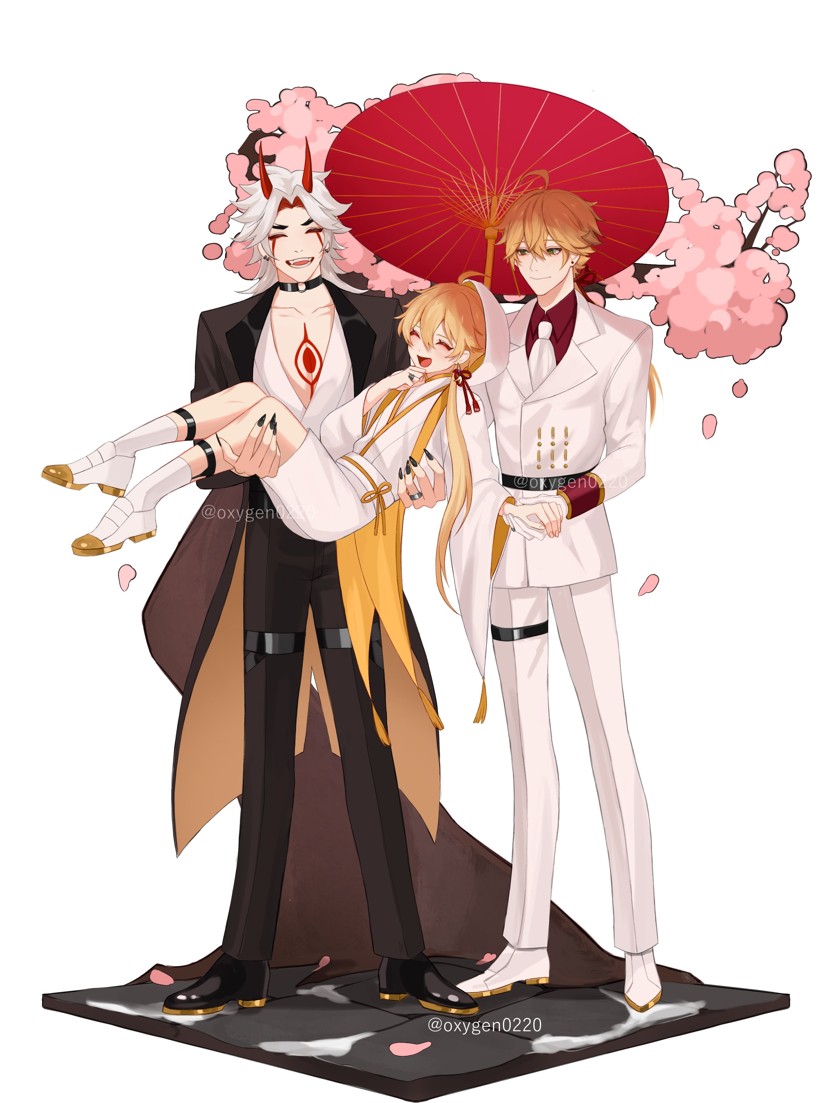 3boys ^_^ absurdres aether_(genshin_impact) arataki_itto bare_legs blonde_hair brown_jacket brown_pants cherry_blossoms closed_eyes closed_mouth earrings forehead genshin_impact green_eyes hair_between_eyes highres horns jacket japanese_clothes jewelry long_hair long_sleeves male_focus multiple_boys necktie oni_horns open_mouth oxygen_(0220) pants red_shirt red_umbrella shirt shoes thoma_(genshin_impact) umbrella white_footwear white_hair white_necktie white_pants white_shirt