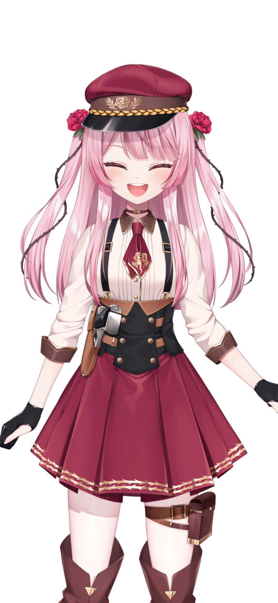 1girl abandon_ranka absurdres belt black_corset black_gloves blush boots brown_belt brown_boots brown_choker choker closed_eyes collared_shirt corset dress_shirt fingerless_gloves flower gloves gun handgun hat highres long_hair long_sleeves looking_at_viewer military military_hat military_uniform necktie nijisanji nijisanji_en official_alternate_costume official_art pantyhose peaked_cap pink_hair pouch red_flower red_hat red_necktie red_rose red_skirt rose rosemi_lovelock rosemi_lovelock_(military) second-party_source shirt short_side_ponytail side_ponytail simple_background skirt smile solo suspender_skirt suspenders thigh_belt thigh_boots thigh_strap twintails virtual_youtuber weapon white_background white_pantyhose white_shirt