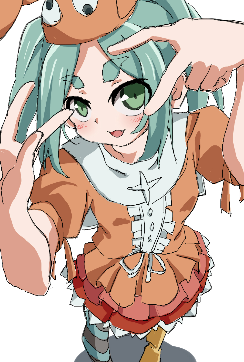 1girl aqua_hair bad_id bad_pixiv_id center_frills dress feet_out_of_frame foreshortening frills from_above green_eyes highres kororopon looking_at_viewer medium_hair monogatari_(series) ononoki_yotsugi open_mouth orange_dress puffy_short_sleeves puffy_sleeves shadow short_sleeves solo