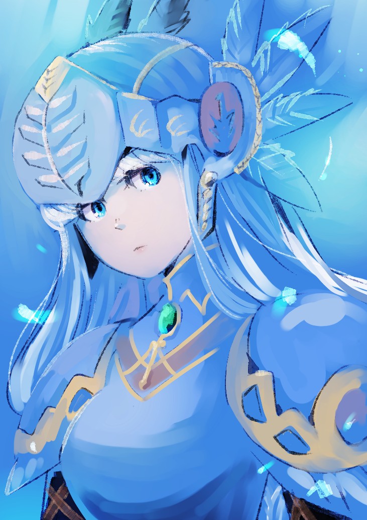 1girl armor armored_dress blue_armor blue_eyes dress gem gold_trim helmet lenneth_valkyrie long_hair portrait shoulder_armor solo_focus tomo_(yukimikan) valkyrie valkyrie_profile_(series) valkyrie_profile_1 winged_helmet