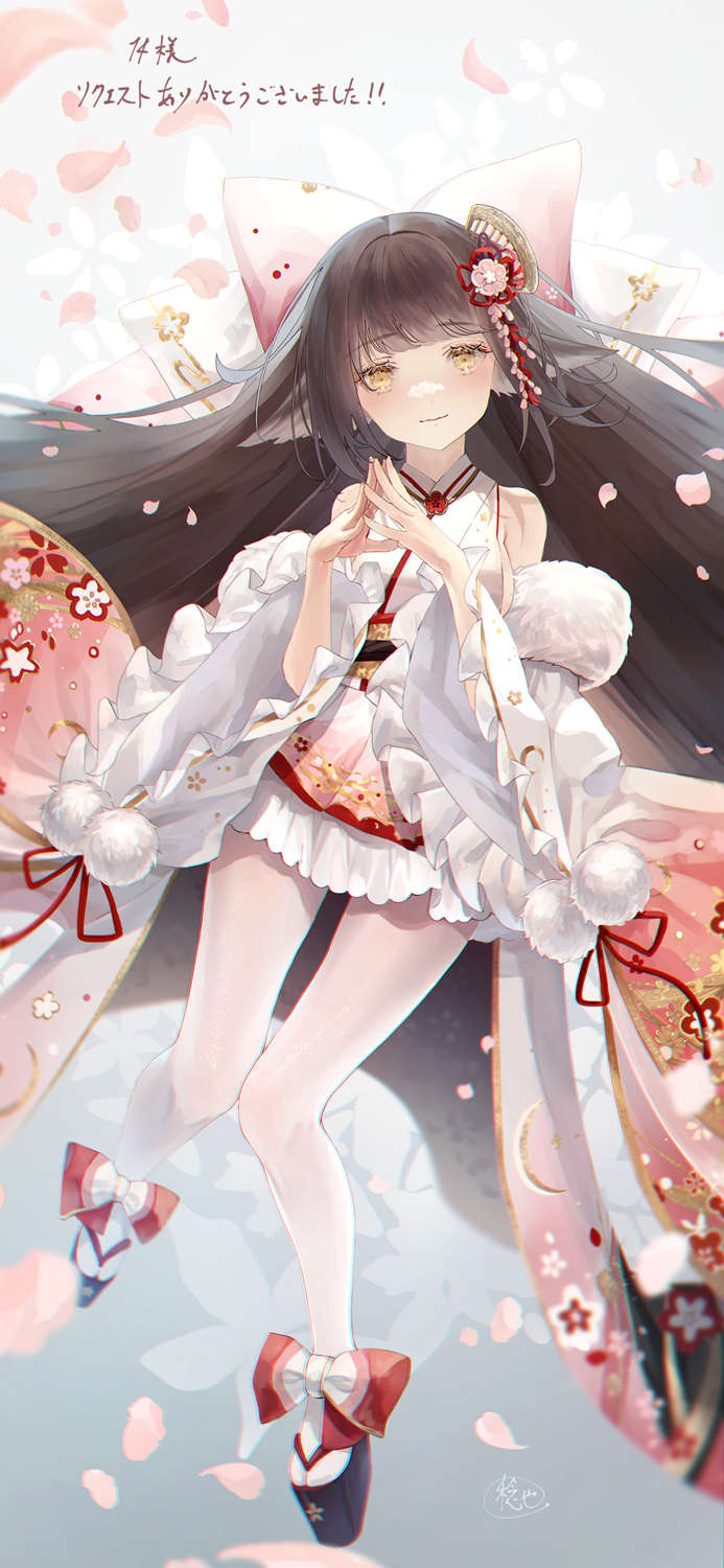 1girl animal_ears azur_lane bare_shoulders bow breasts brown_hair cherry_blossoms closed_mouth commission footwear_ribbon frilled_kimono frilled_skirt frills geta hair_bow hair_ornament harutsuki_(azur_lane) highres japanese_clothes kanzashi kimono kimono_skirt knees_together_feet_apart light_smile long_sleeves looking_at_viewer medium_breasts metro_stars85 pantyhose pink_bow platform_clogs pom_pom_(clothes) red_ribbon ribbon second-party_source sideboob skirt smile solo steepled_fingers tabi thigh_gap white_kimono white_pantyhose wide_sleeves yellow_eyes