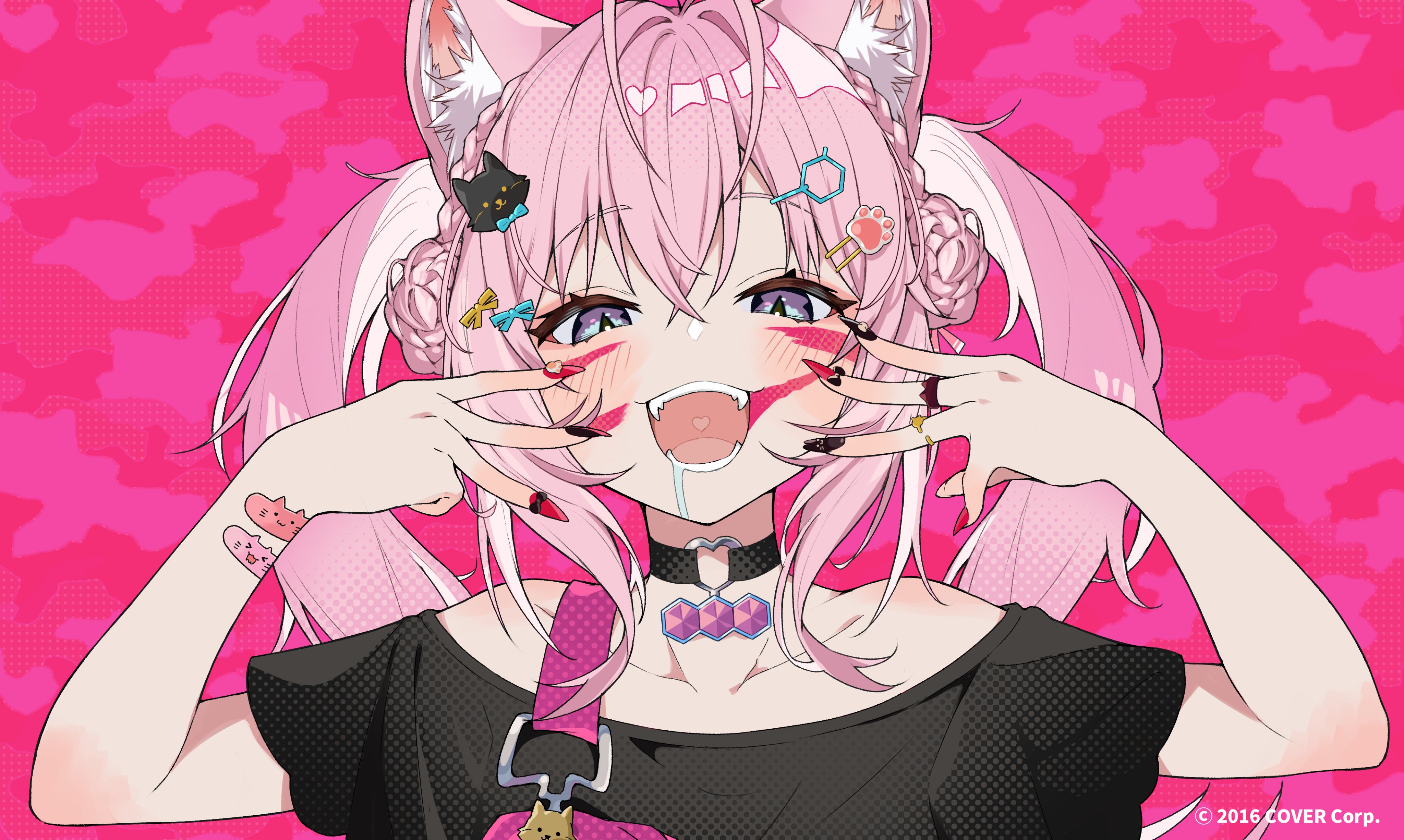 1girl absurdres animal_(vocaloid) animal_ear_fluff animal_ears antenna_hair bandaid bandaid_on_arm black_choker black_nails black_shirt blush braid braided_bun choker crown_braid double_bun drooling fangs hair_bun hair_ornament hairclip hakui_koyori heart heart_o-ring heart_ring_choker hexagon_hair_ornament highres hololive long_hair looking_at_viewer multicolored_nails nail_polish narita_tamezou o-ring o-ring_choker off-shoulder_shirt off_shoulder official_art open_mouth paint_splatter paint_splatter_on_face paw_hair_ornament pink_hair purple_eyes red_nails saliva shirt solo t-shirt upper_body virtual_youtuber vocaloid wolf_ears