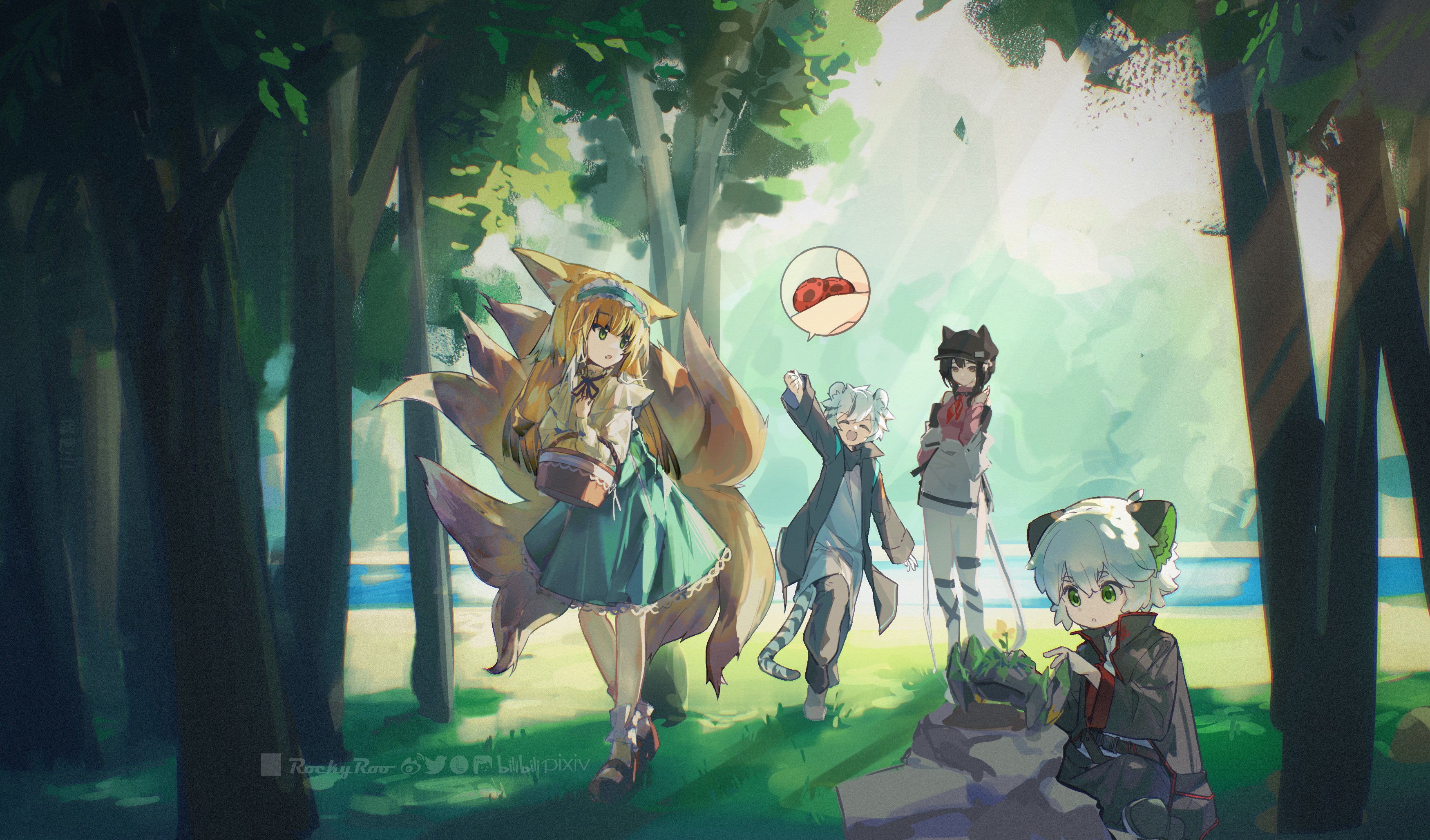 2boys 2girls :o absurdres animal animal_ear_fluff animal_ears arknights black_footwear black_jacket black_pants blonde_hair blue_hairband blue_skirt bug character_request commentary_request crossover day forest fox_ears fox_girl fox_tail frilled_hairband frills green_eyes hair_between_eyes hairband hand_up highres holding holding_animal insect jacket kitsune ladybug long_hair long_sleeves luo_xiaohei multiple_boys multiple_girls nature open_clothes open_jacket outdoors pants parted_lips pink_shirt puffy_long_sleeves puffy_sleeves rockrock_(arknights) rockrock_(before_singing)_(arknights) rockyroo shirt shoes skirt sleeves_past_wrists socks standing suzuran_(arknights) suzuran_(spring_praise)_(arknights) tail luo_xiaohei_zhanji tiger_ears tiger_girl tiger_tail tree very_long_hair walking white_shirt white_skirt white_socks