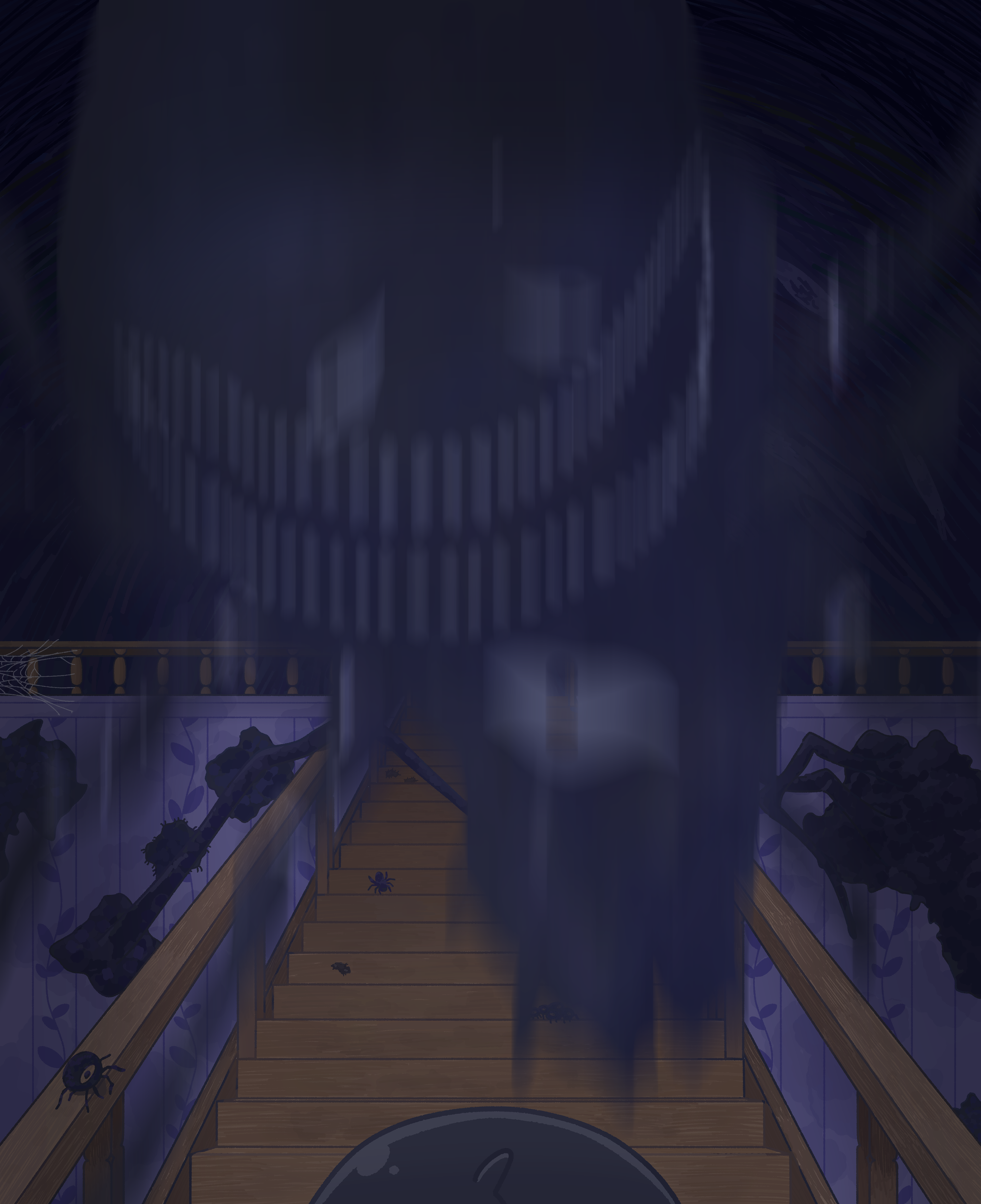 1boy absurdres black_hair bug highres indoors motion_blur night omori railing scene_reference short_hair silk something_(omori) something_in_the_walls_(omori) spider spider_web spoilers stairs sunny_(omori) wafu_(wafu39080)