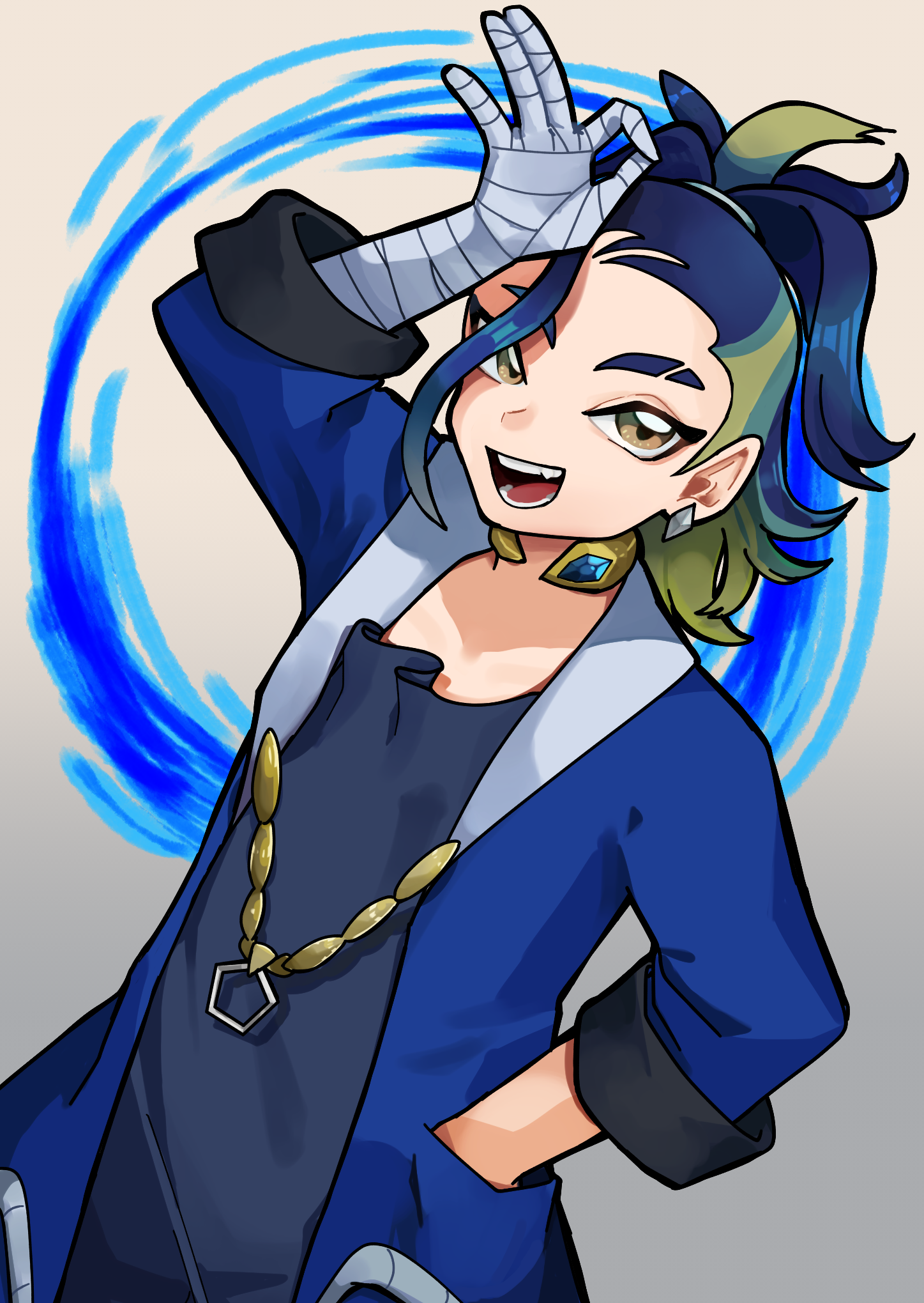 1boy :d adaman_(pokemon) arm_up blue_coat blue_hair brown_eyes coat collar commentary_request earrings eyebrow_cut green_hair hand_in_pocket hand_wraps highres jewelry looking_at_viewer male_focus maru_(purana1) multicolored_hair nintendo ok_sign open_clothes open_coat open_mouth pokemon pokemon_legends:_arceus ponytail smile solo teeth tongue