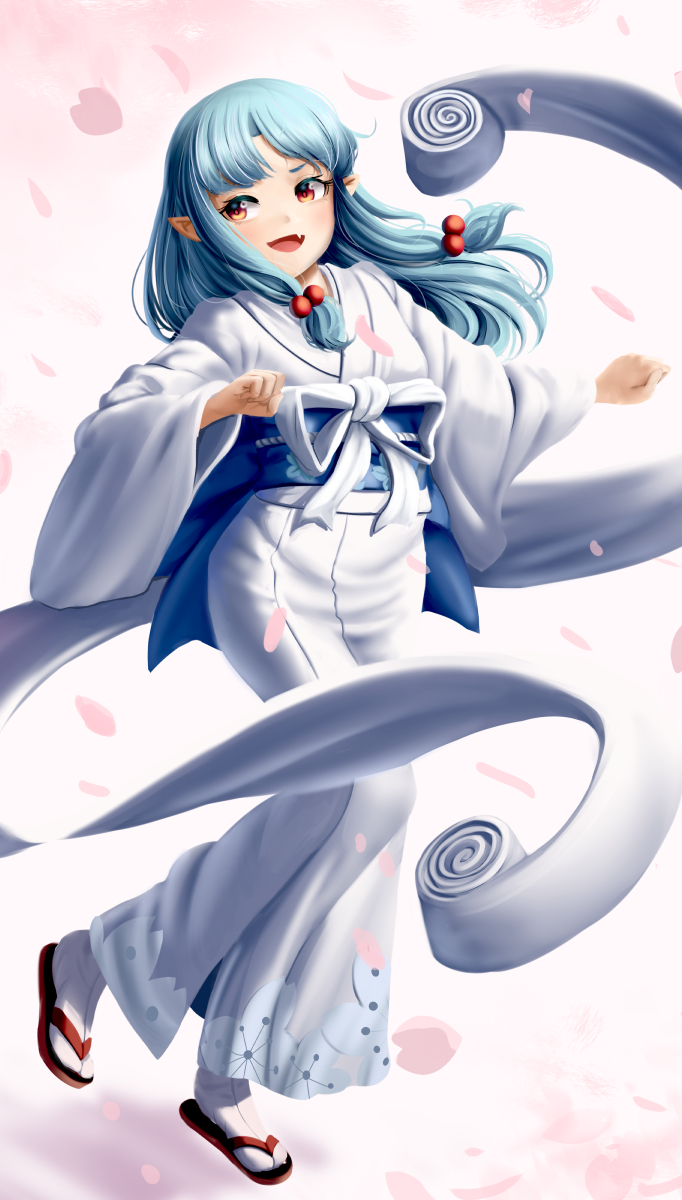1girl :d blue_hair cherry_blossoms commission dkoro fang floating_hair full_body hair_bobbles hair_ornament highres japanese_clothes kimono kiriha_(tsugumomo) long_hair long_sleeves obi open_mouth orange_eyes pointy_ears sash smile socks solo standing standing_on_one_leg tabi tsugumomo very_long_hair white_kimono white_socks wide_sleeves