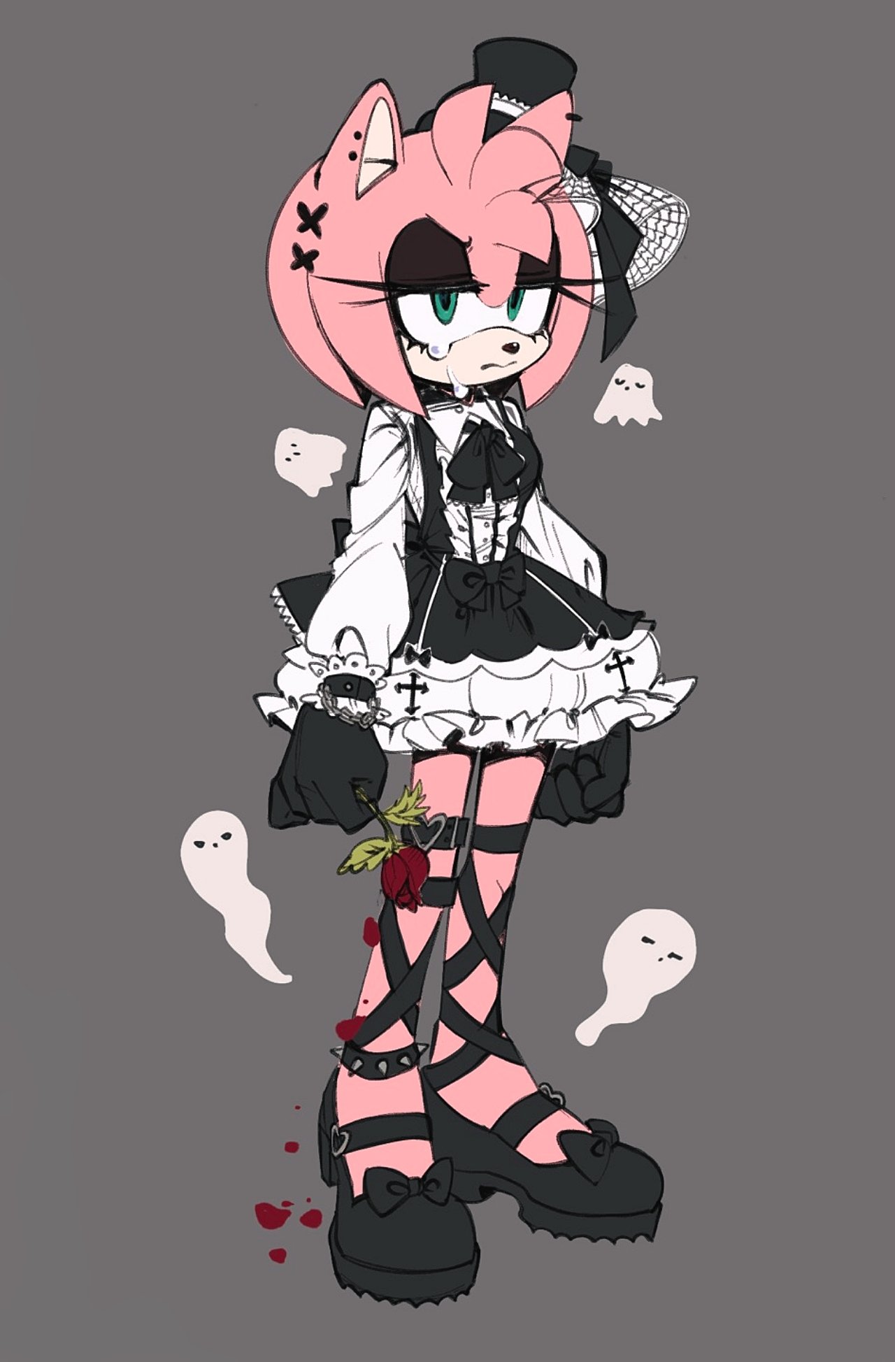 1girl 3mia_hadi3 amy_rose amy_rose_(gothic) animal_ears animal_nose boots dress frills furry furry_female gloves goth_fashion gothic_lolita green_eyes hairband hat hedgehog_girl highres lolita_fashion pink_fur pink_hair ribbon short_hair simple_background solo sonic_(series) sonic_runners tears white_gloves
