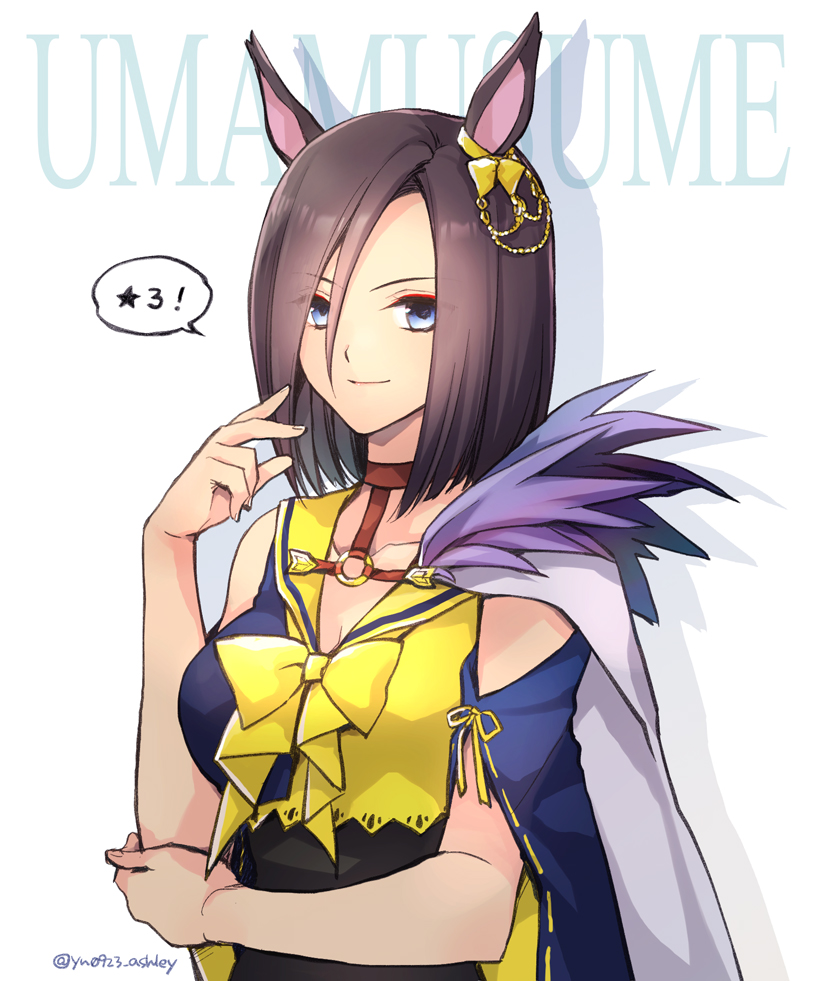 1girl air_groove_(umamusume) animal_ears arm_across_chest blue_eyes bob_cut bow breasts brown_hair cape chain detached_sleeves ear_ribbon fur_trim gold_chain hair_between_eyes hand_up horse_ears horse_girl large_breasts looking_at_viewer ribbon short_hair smile solo speech_bubble takafuji_yuna twitter_username umamusume upper_body white_background yellow_bow yellow_ribbon
