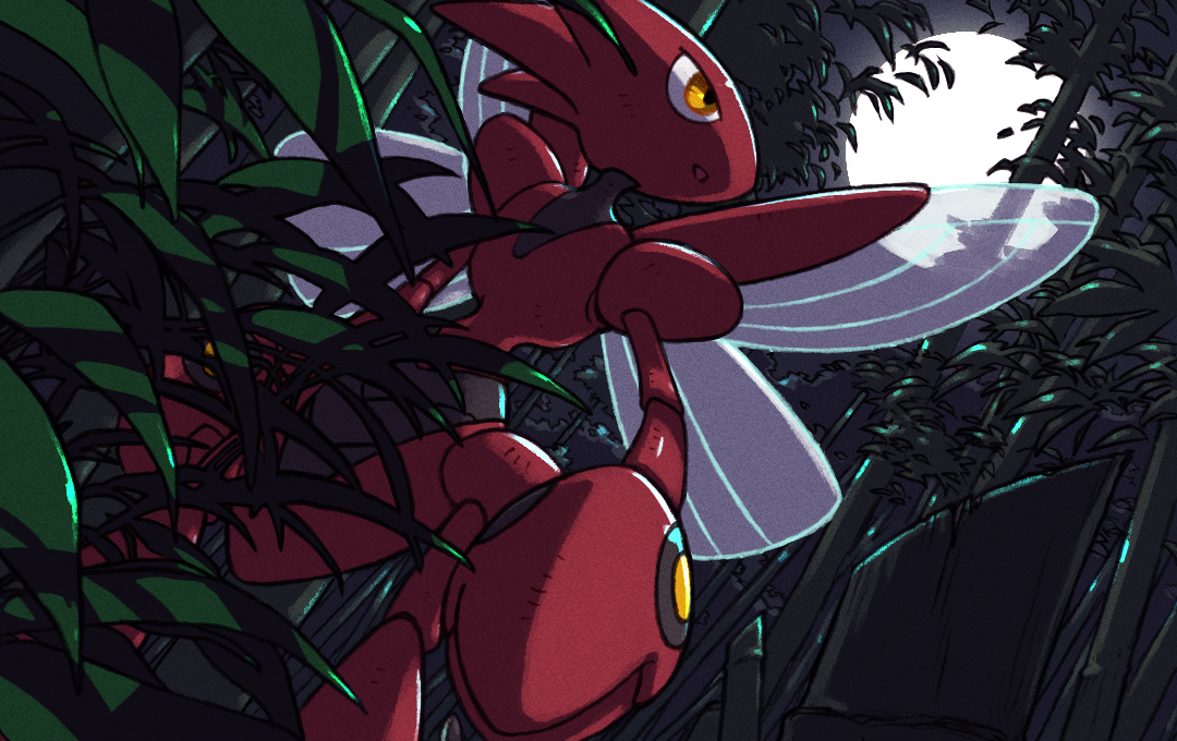 bad_id bad_pixiv_id bamboo bamboo_forest commentary_request forest from_below gen_2_pokemon lico_(sasya_k) looking_up moon nature night nintendo no_humans orange_eyes outdoors parted_lips pokemon pokemon_(creature) scizor sky solo standing