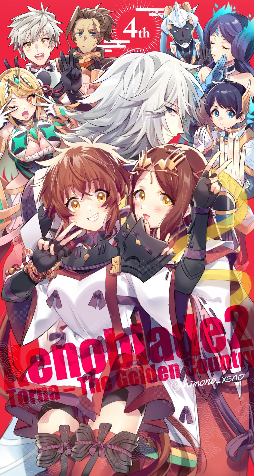 addam_origo aegaeon_(xenoblade) bare_shoulders blonde_hair breasts brighid_(xenoblade) chest_jewel cleavage cleavage_cutout clothing_cutout dress earrings elbow_gloves fan_la_norne gloves highres himeno345 hugo_ardanach jewelry jin_(xenoblade) large_breasts long_hair lora_(xenoblade) mikhail_(xenoblade) minoth_(xenoblade) multiple_boys multiple_girls mythra_(xenoblade) short_dress swept_bangs tiara very_long_hair white_dress white_gloves xenoblade_chronicles_(series) xenoblade_chronicles_2 xenoblade_chronicles_2:_torna_-_the_golden_country yellow_eyes