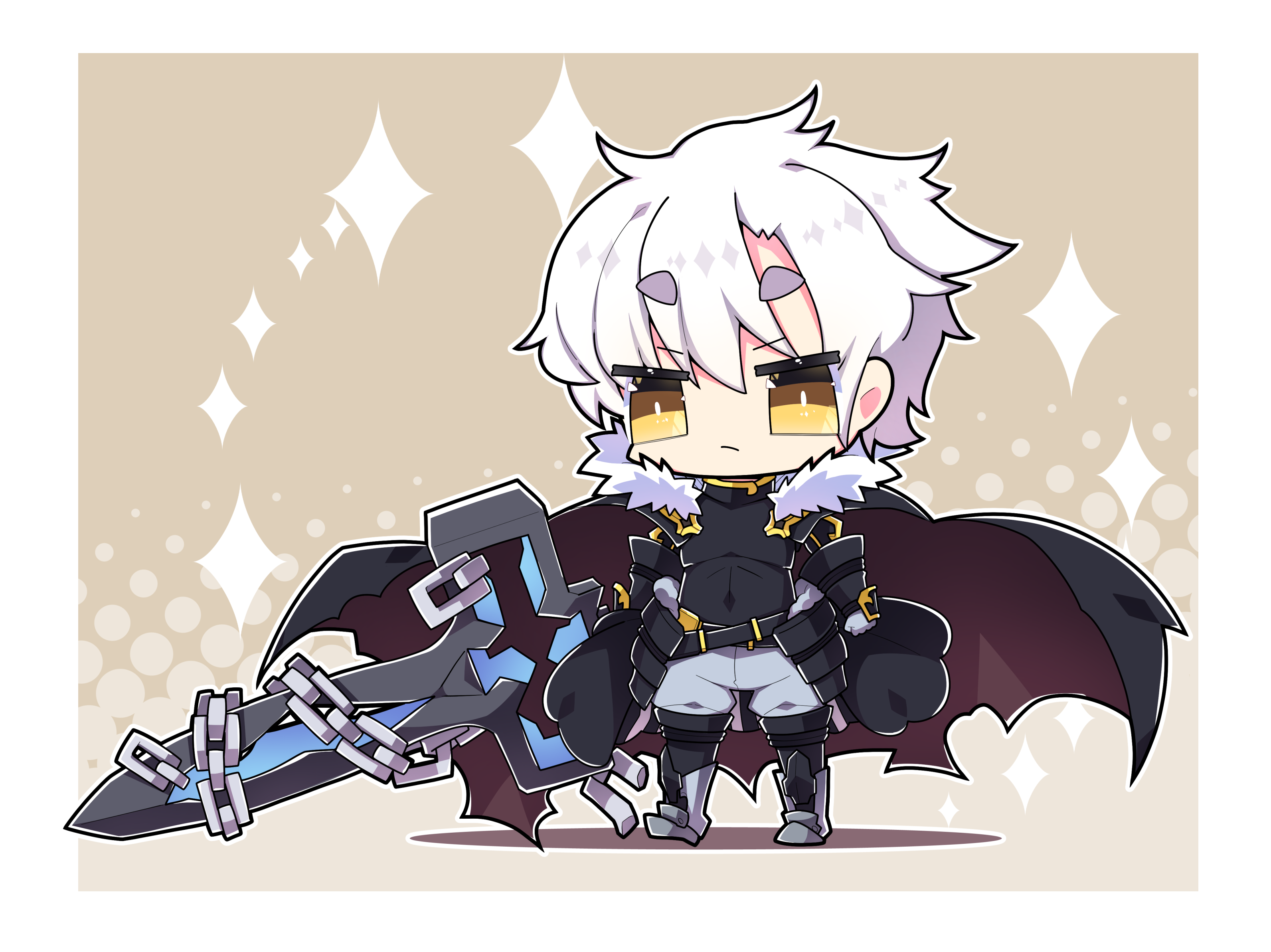 1boy armored_boots black_boots black_cape black_shirt boots brown_background brown_cape cape chain chibi closed_mouth commentary_request covered_navel emperor_(sennen_sensou_aigis) full_body fur-trimmed_cape fur_trim grey_pants hair_between_eyes halftone halftone_background highres holding holding_sword holding_weapon male_focus milkpanda pants sennen_sensou_aigis shadow shirt short_eyebrows solo sparkle standing sword thick_eyebrows thigh_boots weapon white_hair yellow_eyes