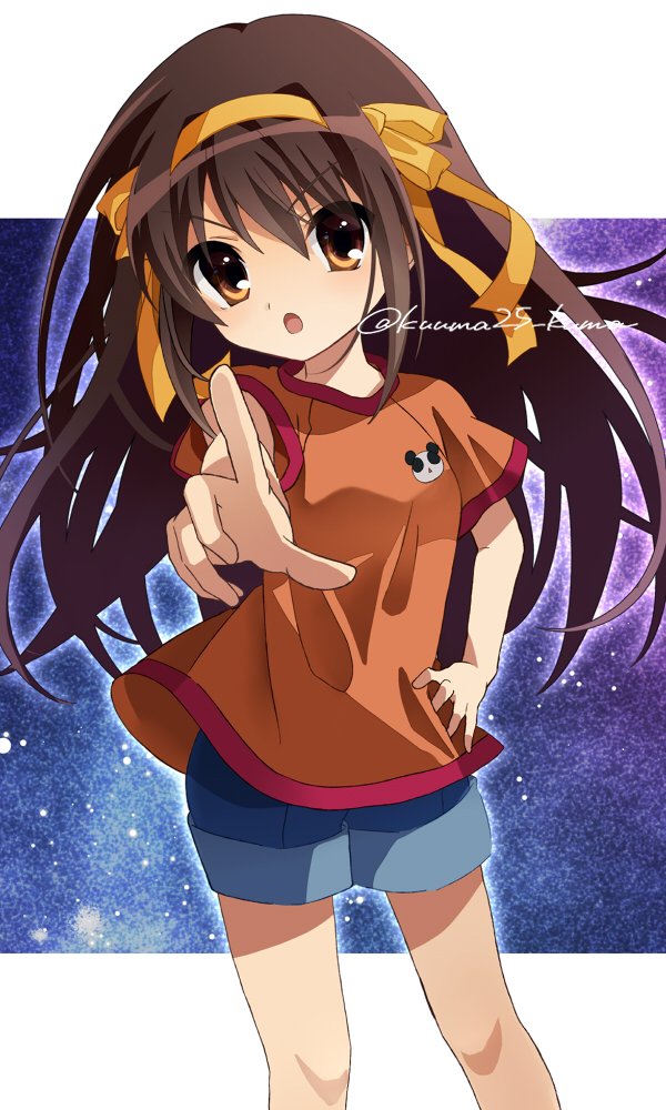 1girl aged_down artist_name blue_shorts brown_eyes brown_hair casual commentary_request denim denim_shorts hair_ribbon hairband kuuma25_kuma long_hair looking_at_viewer open_mouth orange_shirt ribbon shirt shorts simple_background solo suzumiya_haruhi suzumiya_haruhi_(young) suzumiya_haruhi_no_yuuutsu twitter_username watermark white_background yellow_hairband yellow_ribbon