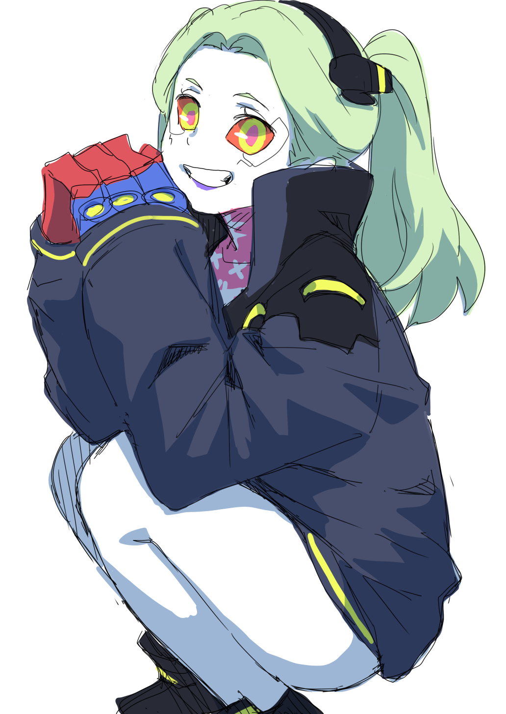 1girl :d artificial_eye black_footwear black_jacket colored_sclera colored_skin commentary_request cyberpunk_(series) cyberpunk:_edgerunners cyborg green_hair highres jacket lipstick looking_at_viewer makeup mechanical_arms single_mechanical_eye neck_tattoo open_mouth purple_lips rebecca_(cyberpunk) red_eyes red_sclera samurai_jacket_(cyberpunk) sketch smile solo squatting tattoo white_background white_skin whoosaku