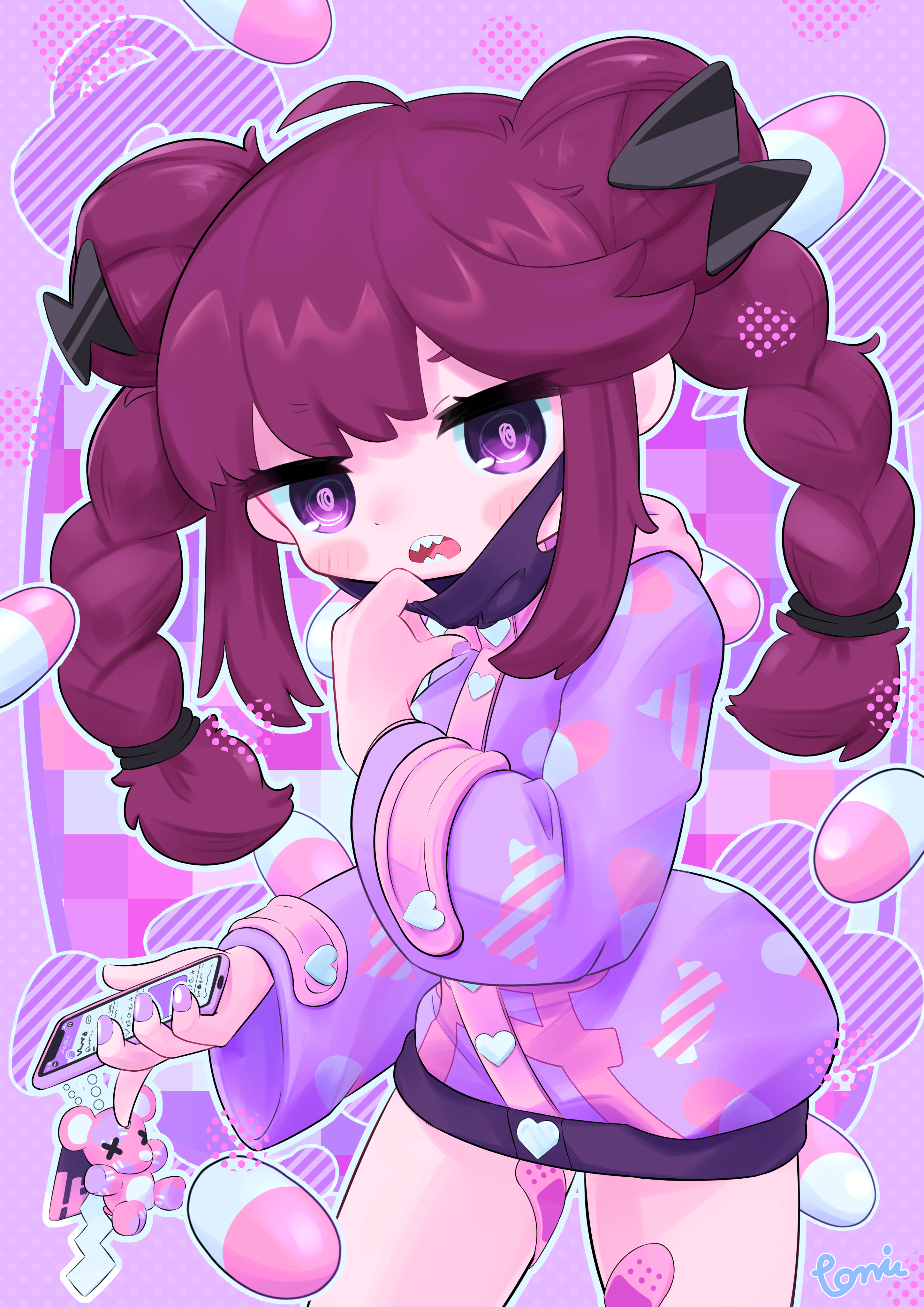1girl absurdres bandaid bow braid cellphone choker denonbu double_bun hair_bow hair_bun hair_ornament highres hood hoodie inubousaki_shian long_sleeves looking_at_viewer open_mouth phone purple_eyes sharp_teeth smartphone solo teeth tomiuimot twin_braids