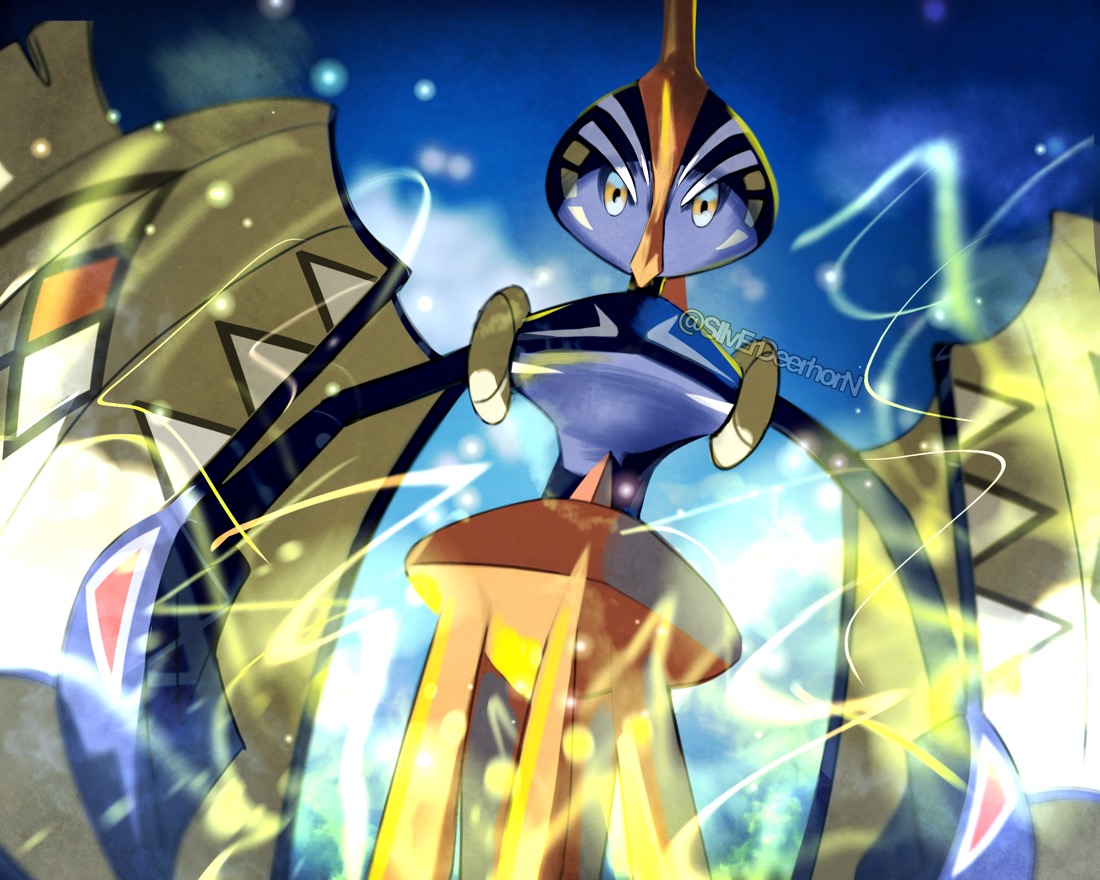 blue_background blurry brown_eyes commentary_request electricity from_below gen_7_pokemon legendary_pokemon looking_at_viewer looking_down nintendo no_humans pokemon pokemon_(creature) silverdeerhorn solo tapu_koko watermark