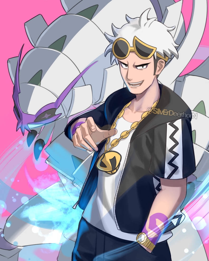 1boy arm_tattoo black_jacket black_pants commentary_request eyewear_on_head gen_7_pokemon golisopod guzma_(pokemon) hand_in_pocket hood hooded_jacket jacket male_focus multicolored_hair nintendo open_mouth pants pink_background pokemon pokemon_(creature) pokemon_sm shirt short_sleeves silverdeerhorn smile sunglasses tattoo team_skull teeth tongue two-tone_hair undercut white_hair white_shirt yellow-framed_eyewear