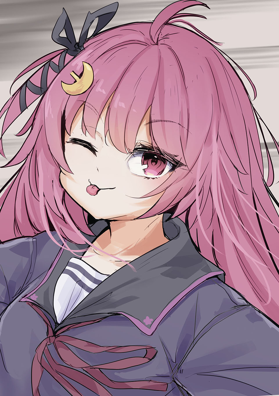 1girl ahoge black_hair blue_shirt commentary_request crescent crescent_hair_ornament hair_ornament hair_ribbon highres kantai_collection logiclr long_hair looking_at_viewer neck_ribbon pink_eyes pink_hair ribbon school_uniform serafuku shirt socks solo tongue tongue_out uzuki_(kancolle)