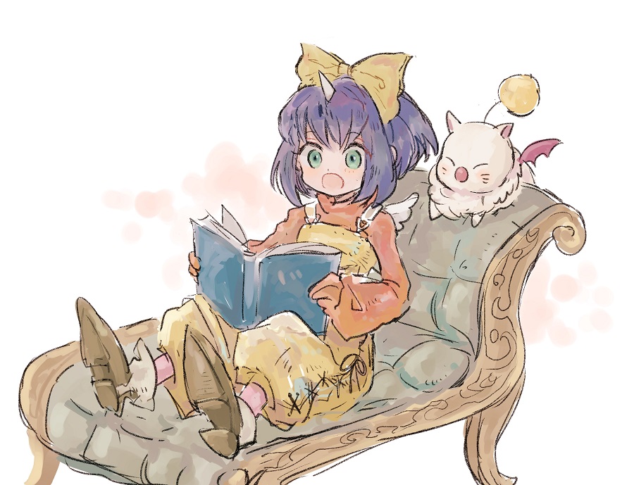 1girl bob_cut book boots bow brown_footwear chaise_longue eiko_carol final_fantasy final_fantasy_ix flat_chest full_body gloves green_eyes hair_bow holding holding_book horns long_sleeves mini_wings moogle nocoyaki open_mouth overalls pink_shirt purple_hair reading shirt single_horn sitting turtleneck white_background wide-eyed wings yellow_bow yellow_overalls