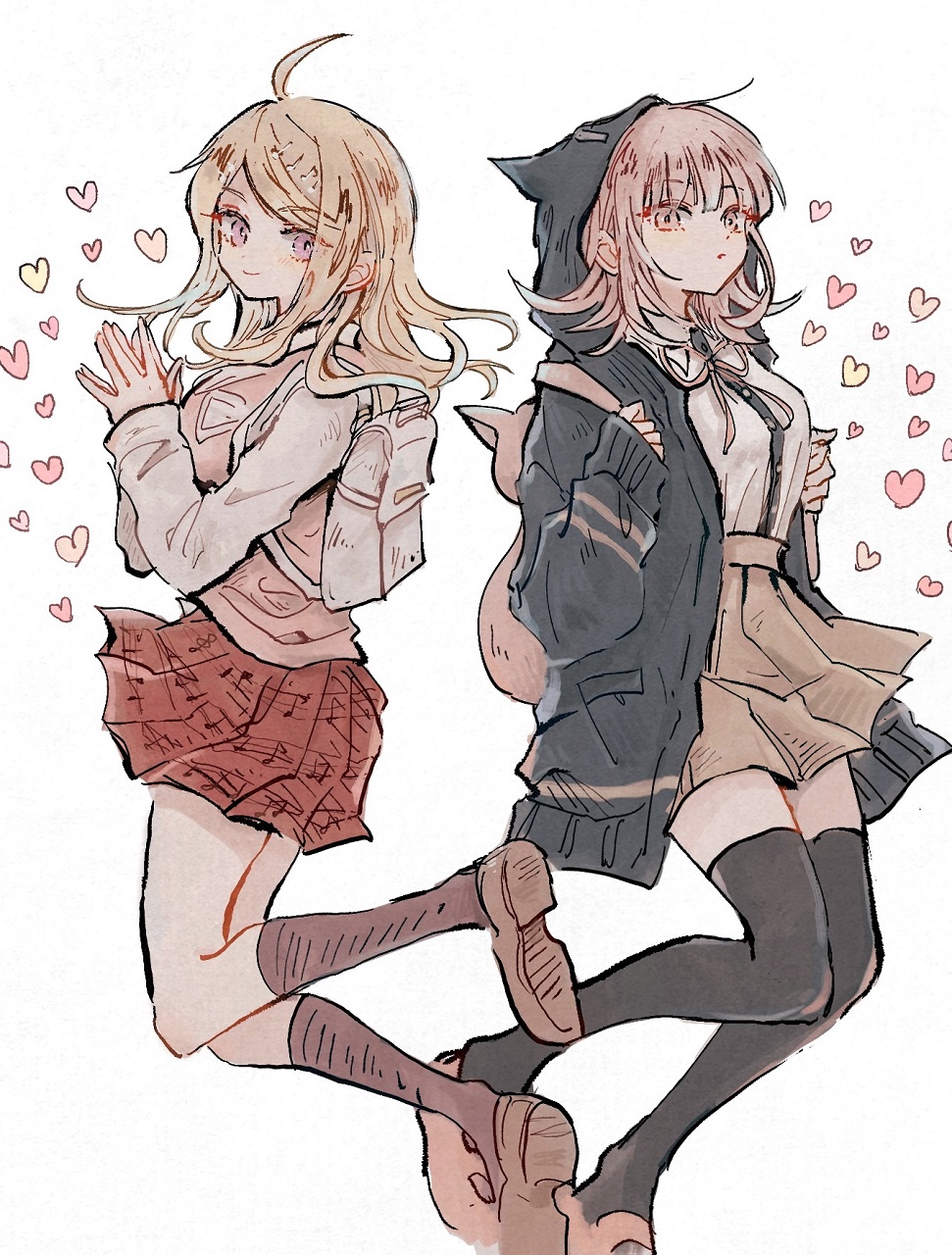 2girls ahoge akamatsu_kaede animal_bag animal_hood back-to-back backpack bag black_hoodie black_thighhighs blonde_hair blunt_bangs breasts brown_footwear kneehighs cat_bag danganronpa_(series) danganronpa_2:_goodbye_despair danganronpa_v3:_killing_harmony dark_skin floating fortissimo full_body hair_ornament heart highres hood hood_up hoodie long_sleeves looking_away medium_breasts multiple_girls musical_note musical_note_hair_ornament nanami_chiaki neck_ribbon nocoyaki own_hands_together pink_bag pink_sweater_vest pleated_skirt red_skirt ribbon school_uniform shirt shirt_tucked_in skirt smile sweater_vest swept_bangs thighhighs white_background white_bag white_shirt zettai_ryouiki