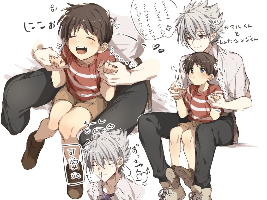 2boys aged_down blood brown_hair brown_shorts child closed_eyes grey_eyes grey_hair ikari_shinji male_focus missing_tooth multiple_boys nagisa_kaworu neon_genesis_evangelion nosebleed open_mouth saba_miso shirt shorts smile striped_clothes striped_shirt translation_request