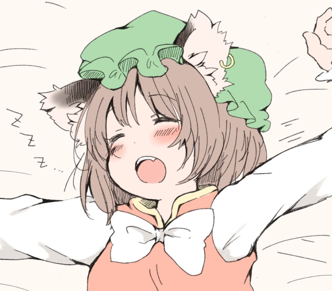 1girl :o animal_ears blush bow bowtie breasts brown_hair cat_ears chen closed_eyes earrings hat jewelry nanana_(chicken_union) open_mouth outstretched_arms sleeping small_breasts solo_focus teeth touhou upper_body upper_teeth_only white_bow white_bowtie