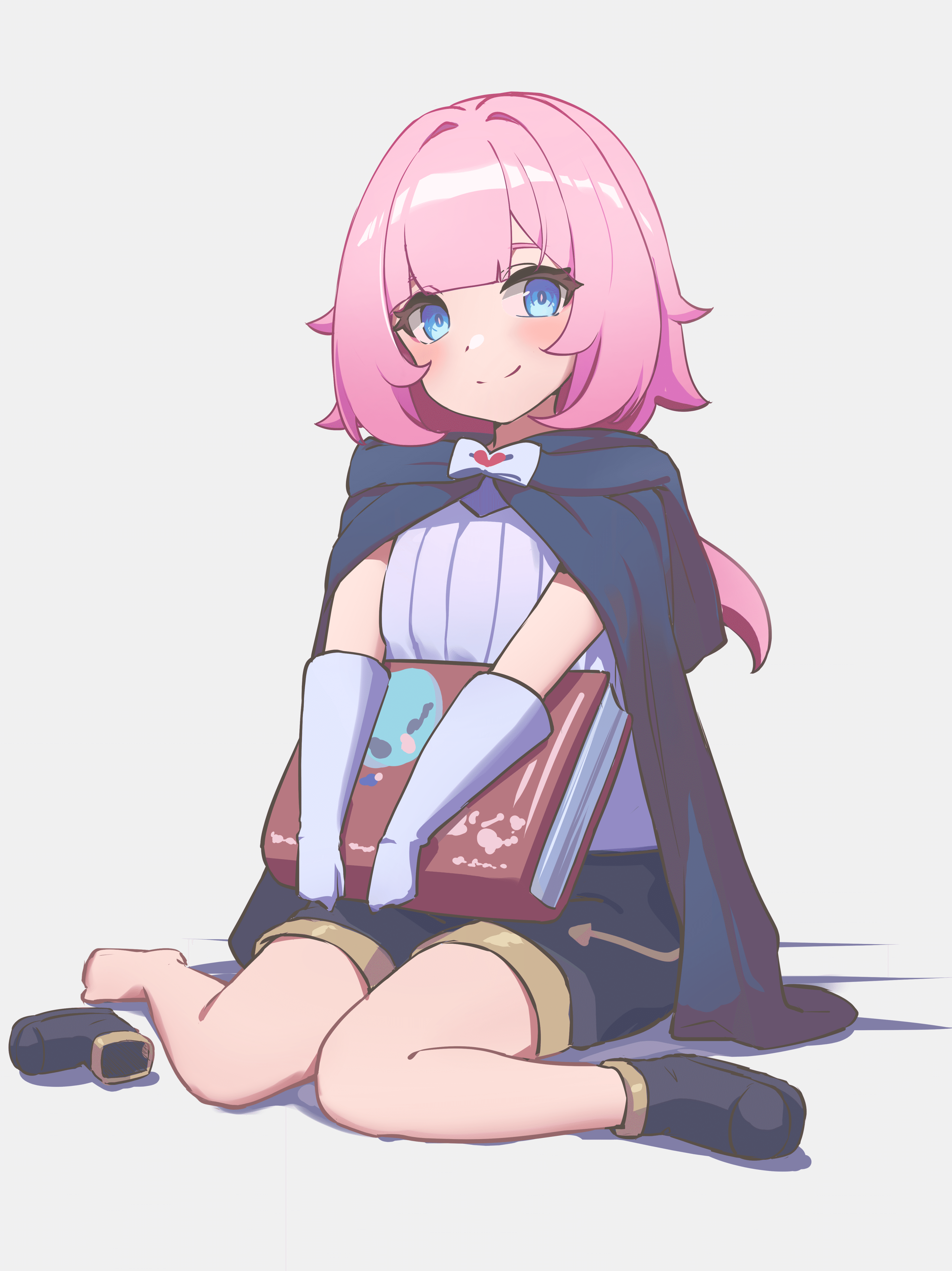 1girl absurdres barefoot black_cape black_shorts blue_eyes book boots cape closed_mouth elysia_(honkai_impact) full_body gloves grey_background highres holding holding_book honkai_(series) honkai_impact_3rd pink_hair ponytail reulem shirt shorts simple_background single_boot sitting sleeveless sleeveless_shirt smile solo toes wariza white_gloves white_shirt