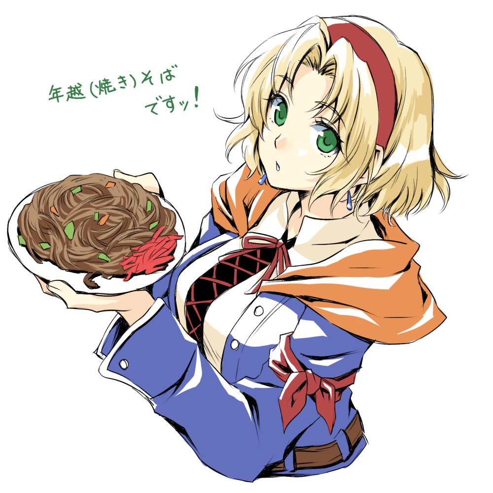1girl belt blonde_hair breasts cecilia_lynne_adelhyde coat cross-laced_clothes earrings food green_eyes hairband jewelry looking_at_viewer oto_nagi red_hairband short_hair simple_background solo white_background wild_arms wild_arms_1 yakisoba