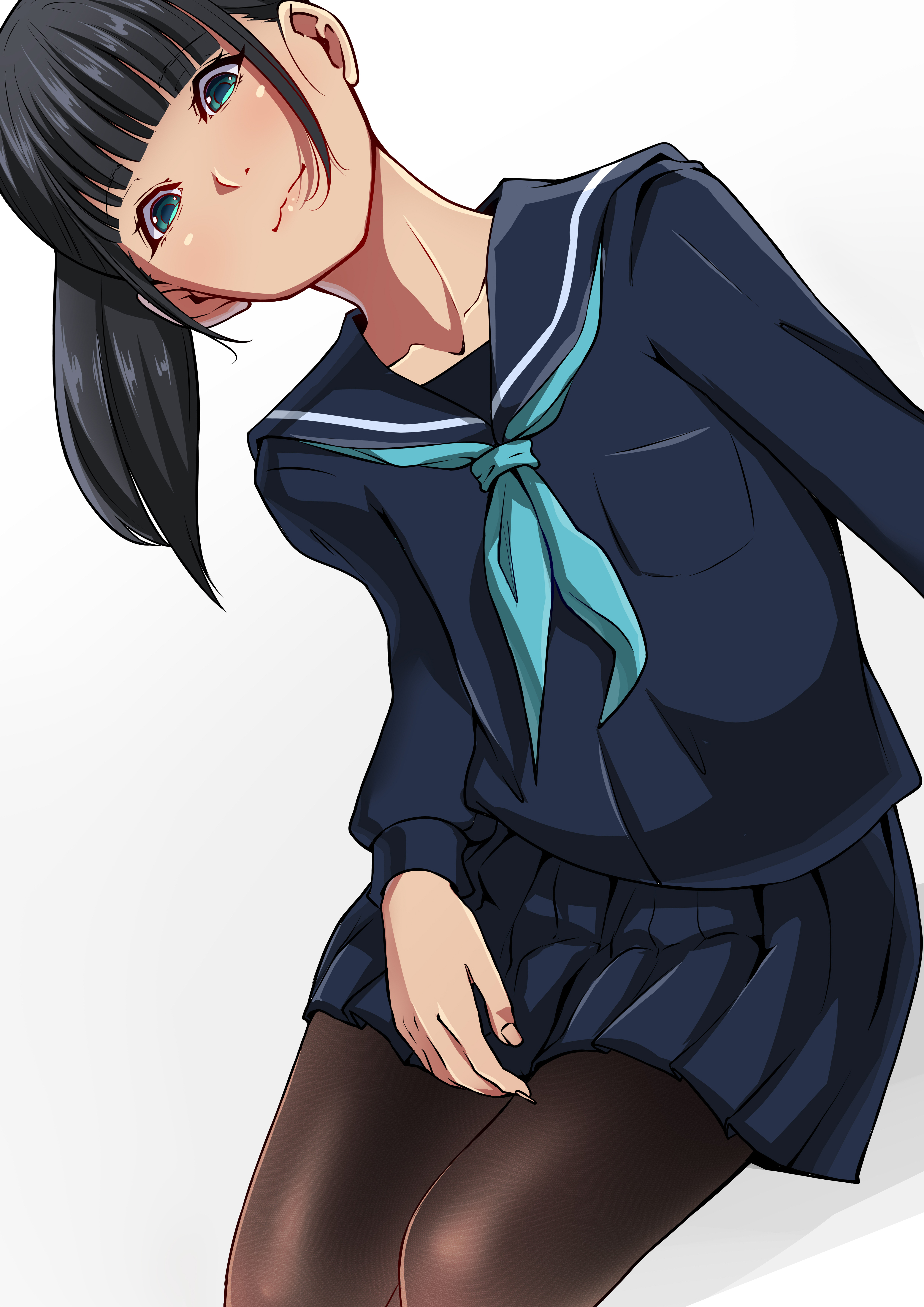 1boy absurdres akaihoppe black_hair black_shirt black_skirt blue_eyes blue_neckerchief blunt_bangs brown_pantyhose closed_mouth crossdressing crossdressing_(mtf) fingernails green_eyes highres long_hair long_sleeves looking_at_viewer male_focus neckerchief original pantyhose ponytail school_uniform serafuku shirt simple_background skirt smile solo trap white_background