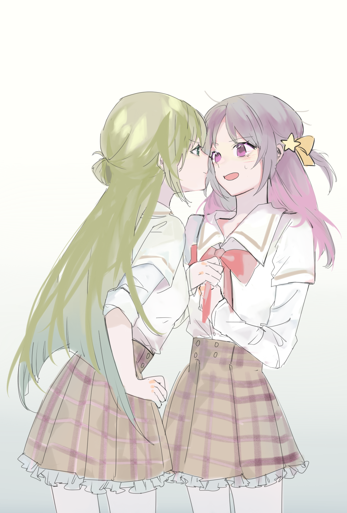 2girls alina_gray aqua_eyes blunt_ends blush bow bowtie green_hair hair_between_eyes hair_ornament hair_ribbon hair_rings highres long_hair loose_bowtie magia_record:_mahou_shoujo_madoka_magica_gaiden mahou_shoujo_madoka_magica medium_hair misono_karin multicolored_hair multiple_girls orange_ribbon parted_bangs parted_hair purple_eyes purple_hair ribbon sakae_general_school_uniform school_uniform sidelocks single_hair_ring skirt sleeves_rolled_up star_(symbol) star_hair_ornament straight_hair streaked_hair tsukinaga1028 two_side_up very_long_hair