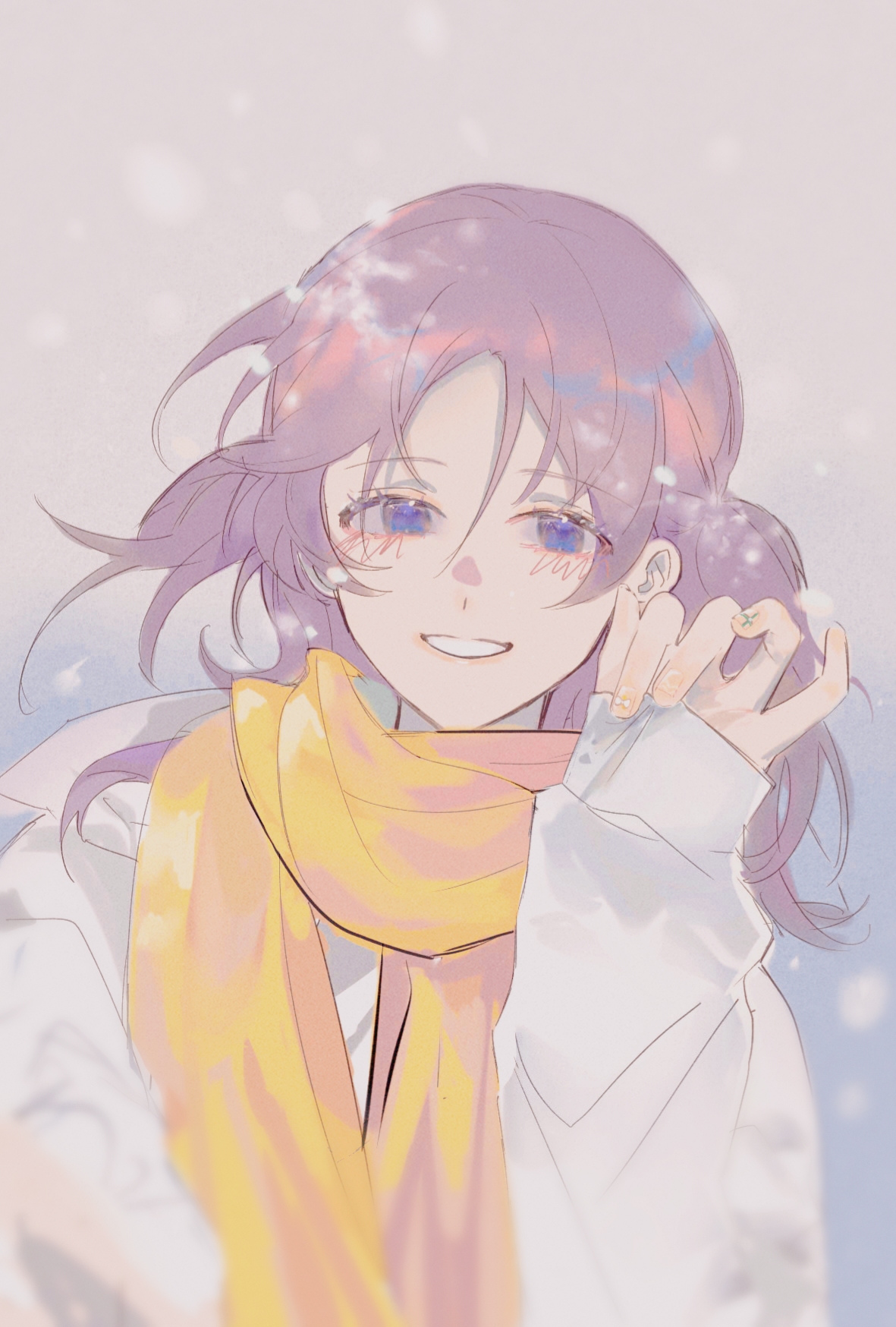 1girl blush highres magia_record:_mahou_shoujo_madoka_magica_gaiden mahou_shoujo_madoka_magica medium_hair misono_karin open_mouth parted_bangs parted_hair purple_eyes purple_hair scarf smile snowflakes solo sweater tsukinaga1028 two_side_up