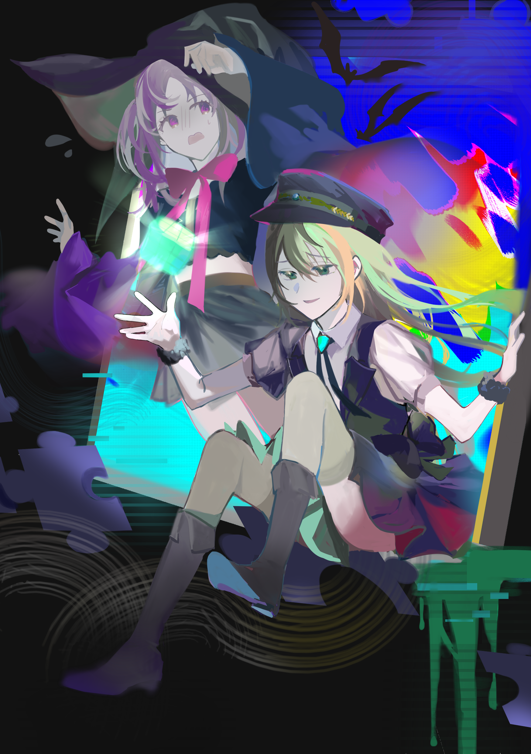 2girls absurdres alina_gray aqua_eyes black_bow black_footwear black_headwear black_necktie black_shirt black_vest blunt_ends boots bow breasts brooch chain collar criss-cross_halter crop_top cross_tie detached_collar fold-over_boots fur_cuffs gem green_gem green_hair hair_bobbles hair_ornament halterneck hat highres jewelry lapels long_hair magia_record:_mahou_shoujo_madoka_magica_gaiden magical_girl mahou_shoujo_madoka_magica medium_hair miniskirt misono_karin multicolored_hair multicolored_skirt multiple_girls necktie notched_lapels parted_bangs parted_hair peaked_cap pink_ribbon pleated_skirt puffy_short_sleeves puffy_sleeves purple_eyes purple_hair ribbon see-through_clothes see-through_sleeves shirt short_sleeves sidelocks skirt sleeve_cuffs small_breasts star_(symbol) straight_hair streaked_hair striped_clothes striped_skirt tsukinaga1028 two_side_up v-neck vertical-striped_clothes vertical-striped_skirt very_long_hair vest waist_bow white_collar white_sleeves witch_hat yellow_gem