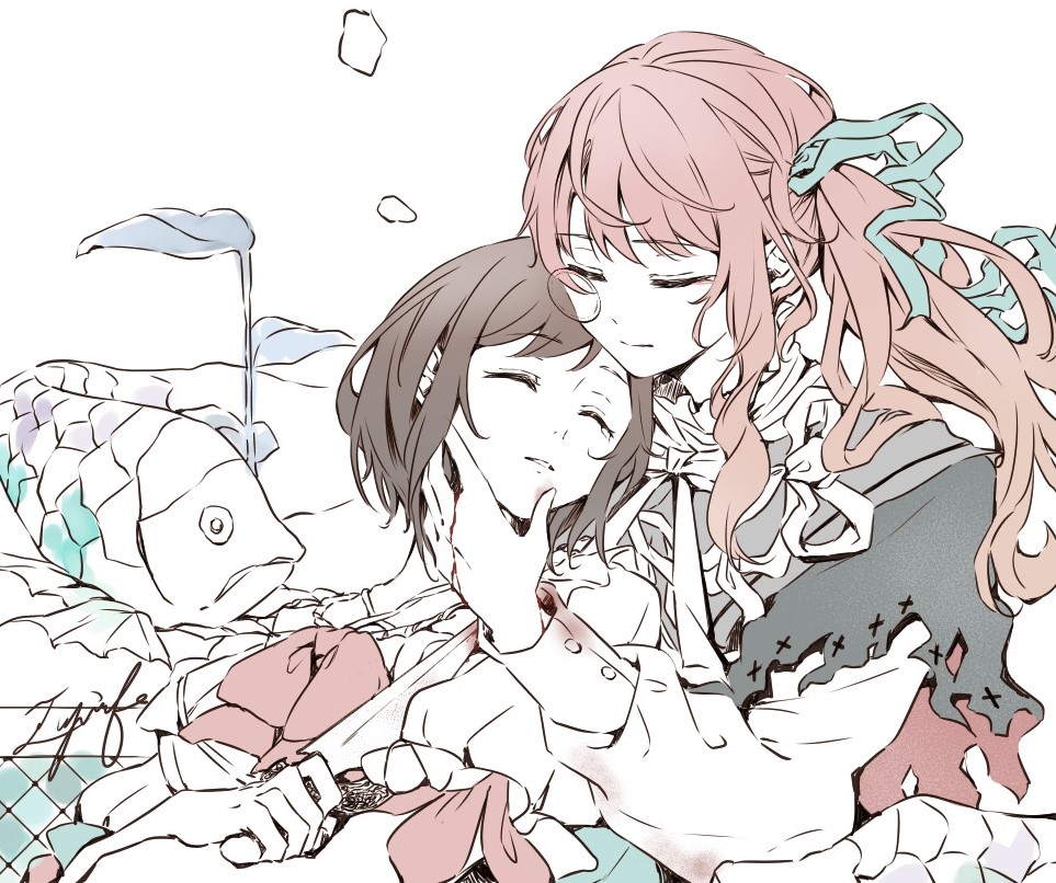 1girl 1other aiiro_bokujuu akiyama_mizuki blood blood_on_hands bow brown_hair closed_eyes commentary fish gehenna_(vocaloid) green_ribbon hair_ribbon hand_on_another's_chin limited_palette long_hair long_sleeves lying lying_on_person on_back partially_colored pink_hair project_sekai ribbon shinonome_ena short_hair side_ponytail swept_bangs untranslatable_commentary vocaloid wavy_hair white_background white_bow white_ribbon