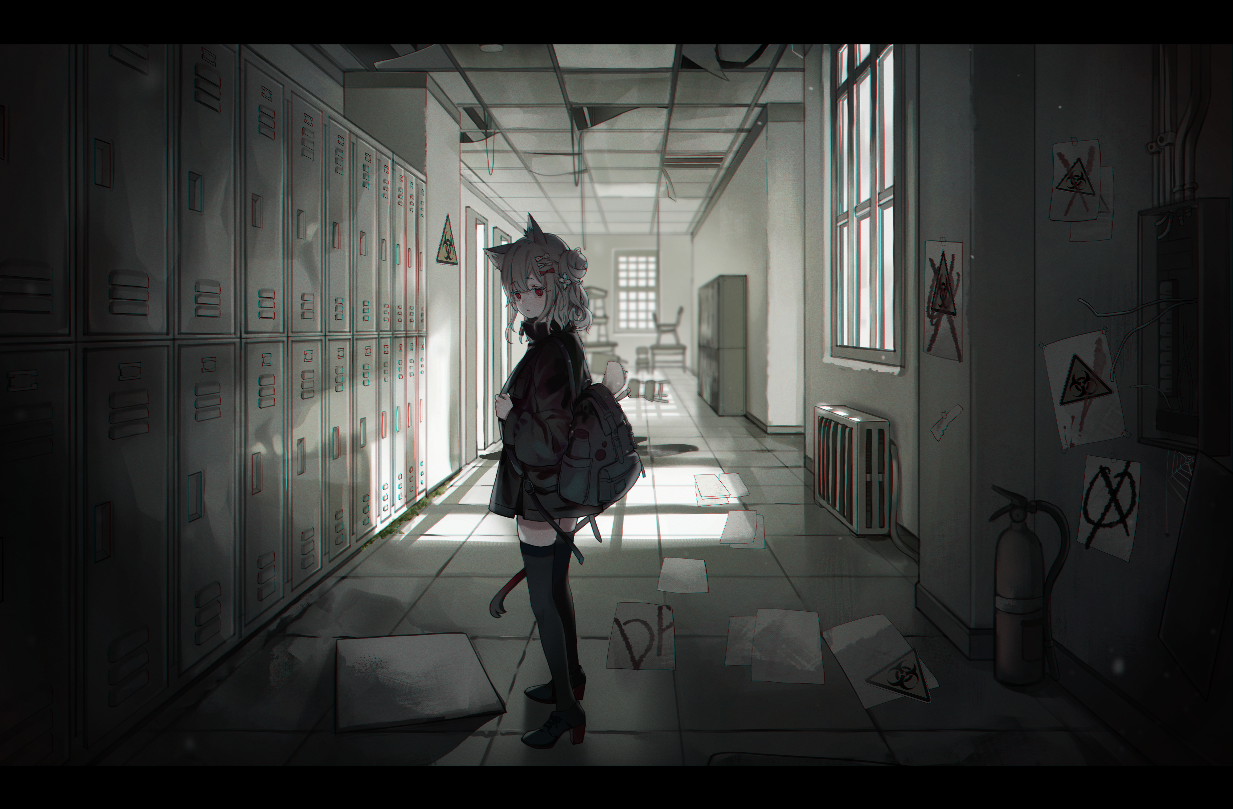 1girl absurdres animal_ear_fluff animal_ears asymmetrical_bangs backpack bag biohazard_symbol bizette black_bag black_coat black_thighhighs blurry blurry_background cat_ears coat crowbar fire_extinguisher full_body grey_hair hair_bun highres holding holding_crowbar holding_strap indoors letterboxed light_particles locker locker_room long_sleeves looking_at_viewer medium_hair original paper platform_footwear radiator red_eyes single_hair_bun solo standing sunlight thighhighs vanishing_point window