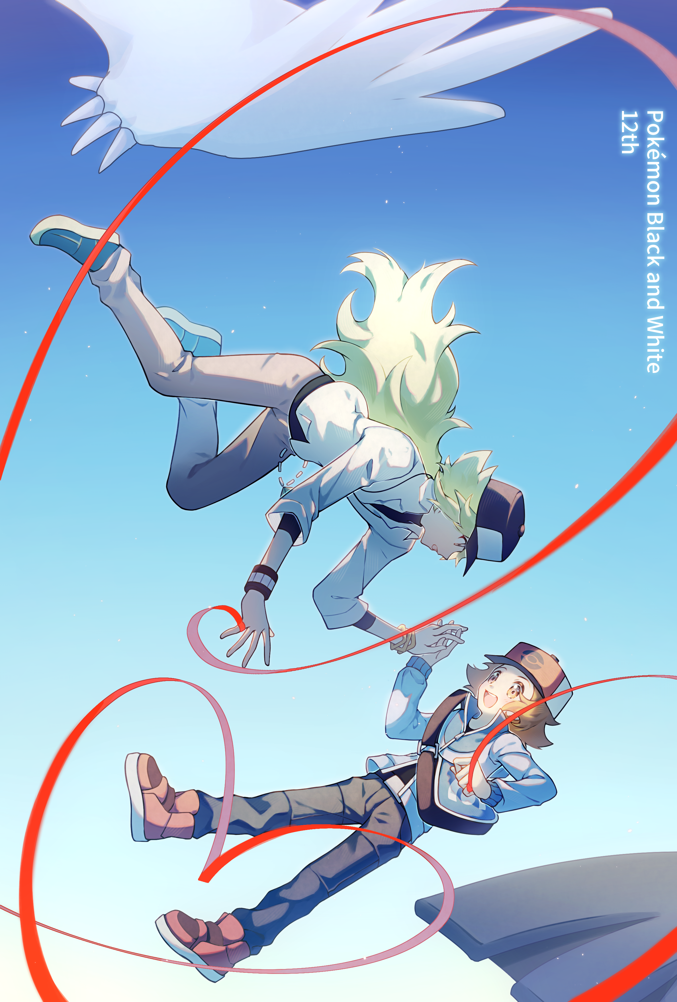 2boys absurdres anniversary bag baseball_cap belt_buckle blue_jacket brown_eyes brown_hair buckle commentary copyright_name day eye_contact gen_5_pokemon green_hair grey_pants hat highres hilbert_(pokemon) holding_hands jacket legendary_pokemon long_hair long_sleeves looking_at_another male_focus messenger_bag multiple_boys n_(pokemon) nintendo outdoors pants poke_ball_print pokemon pokemon_(creature) pokemon_black_and_white ponytail red_footwear red_ribbon reshiram ribbon shirt short_hair shoulder_bag yue_(jinziyuezi) zekrom