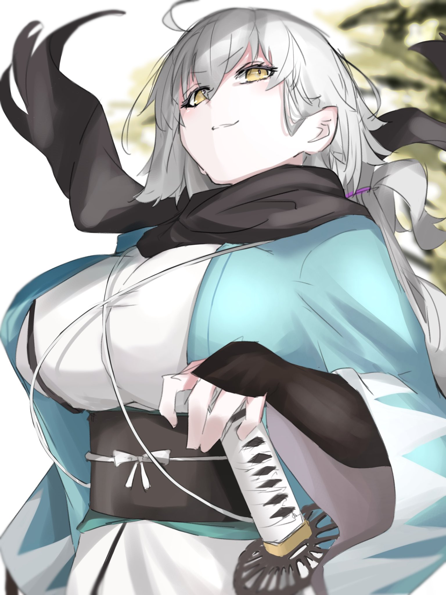 1girl arm_guards black_bow black_scarf bow breasts cosplay fate/grand_order fate_(series) haori highres japanese_clothes jeanne_d'arc_alter_(fate) kimono koha-ace large_breasts obi okita_souji_(fate) okita_souji_(koha-ace) okita_souji_(koha-ace)_(cosplay) okita_souji_(third_ascension)_(fate) ri_o_ne_su sash scarf shinsengumi short_kimono sleeveless sleeveless_kimono smile solo white_hair white_kimono yellow_eyes