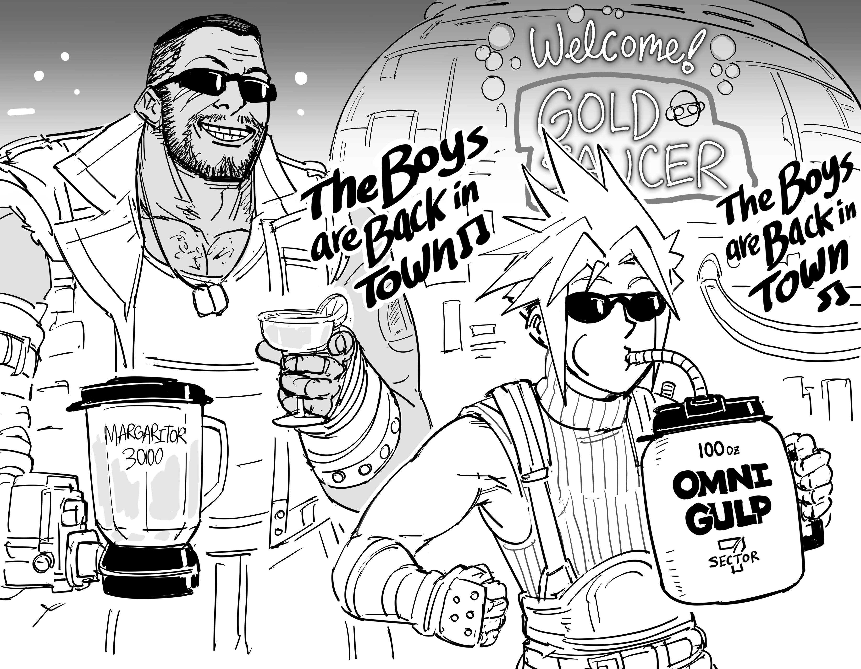 2boys 7-eleven absurdres barret_wallace bb_(baalbuddy) brand_name_imitation cloud_strife dark-skinned_male dark_skin drink english_text facial_hair final_fantasy final_fantasy_vii gold_saucer greyscale grin highres lyrics male_focus margarita monochrome multiple_boys open_mouth short_hair sleeveless smile spiked_hair square_enix sunglasses teeth vest